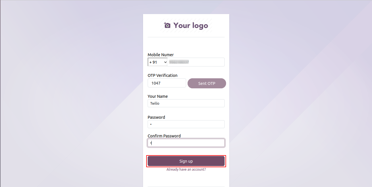 Add the OTP in the OTP Verification field and update the name and password, then click on the 'Sign up'.