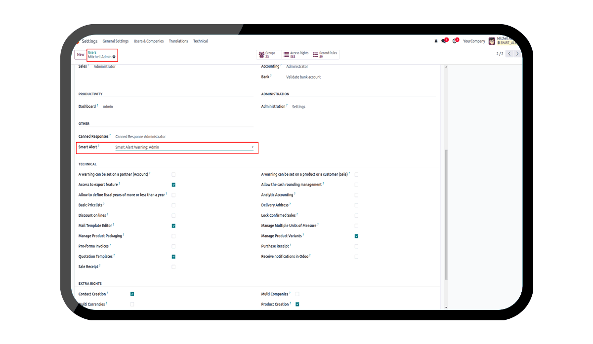 Settings -> Users -> Access Rights -> Smart Alerts Warning: Admin