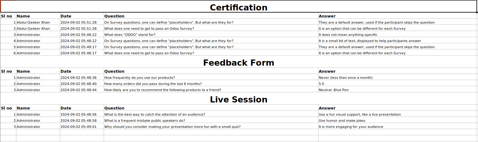 This Module helps to Export Survey Answers in XLSX Format. You can easily get the Questions and Answers of the Corresponding User.