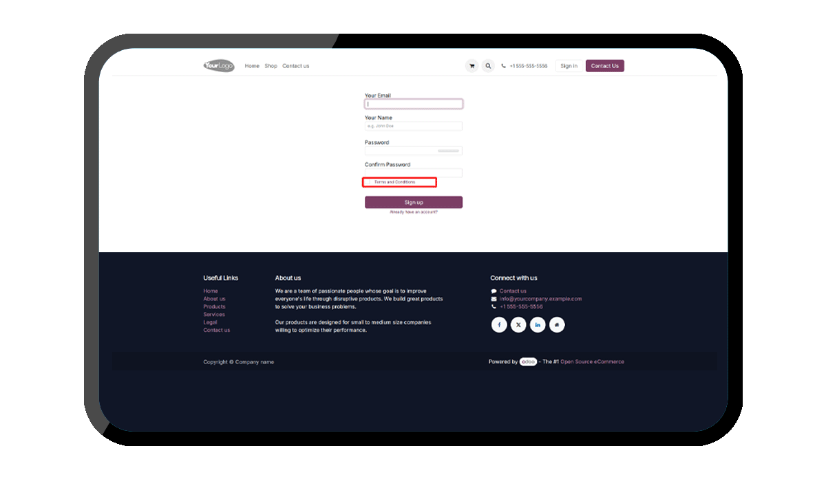 Adds a checkbox on the signup page to accept Terms and Conditions before account creation.