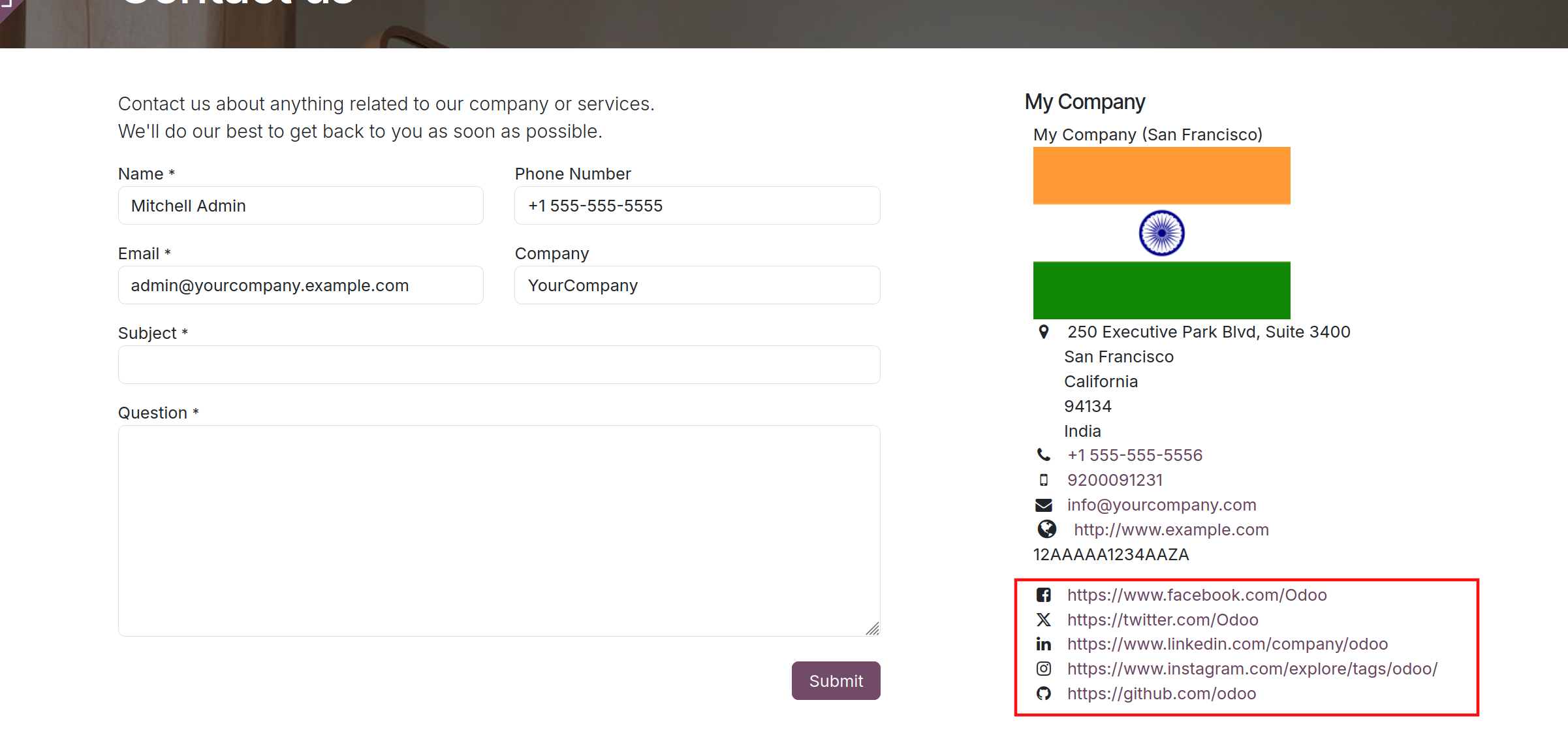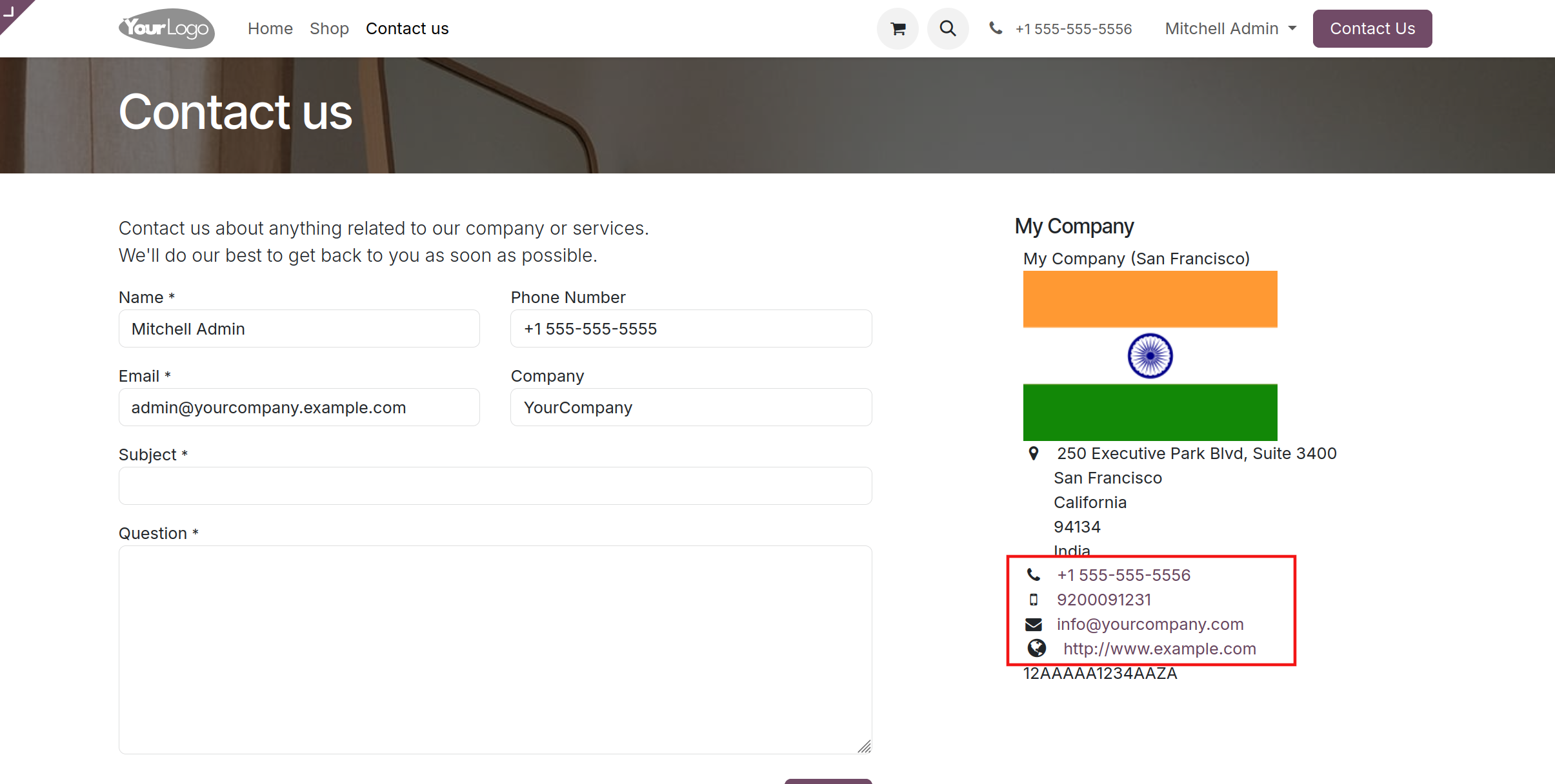 By activating and deactivating the toggle buttons we can set the visibility of company details in the Website Contact Us Page.