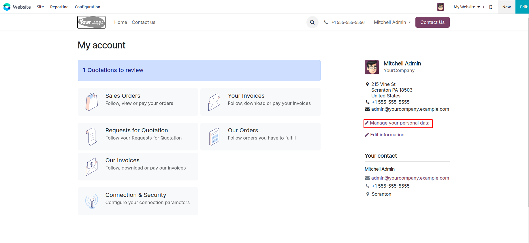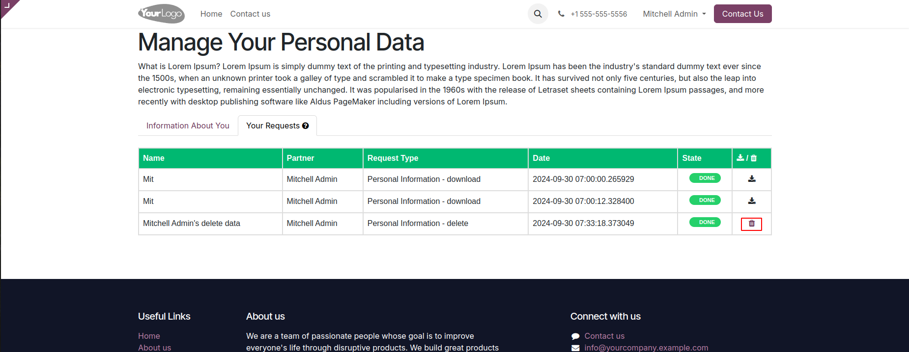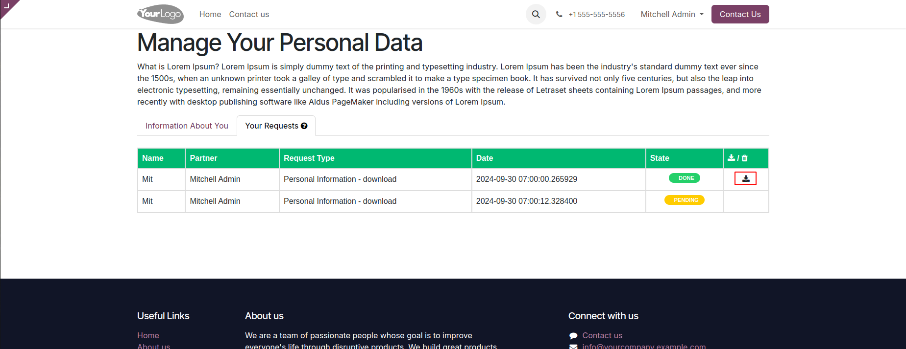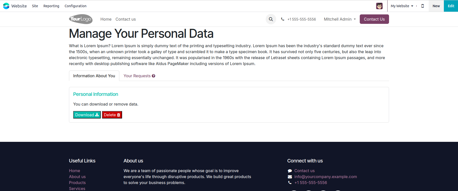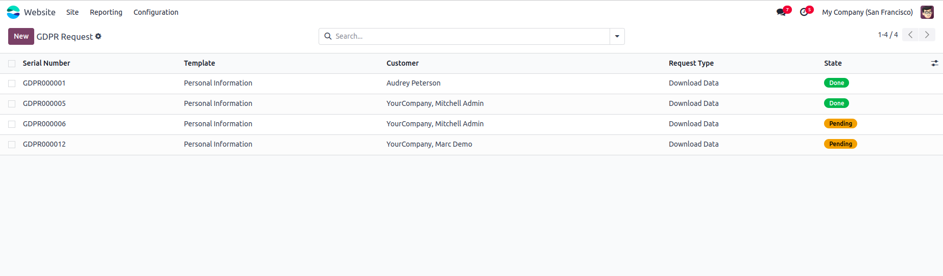 Clicking the Download Button Creates a Request in the Backend. Go to Website > Configuration > GDPR Request