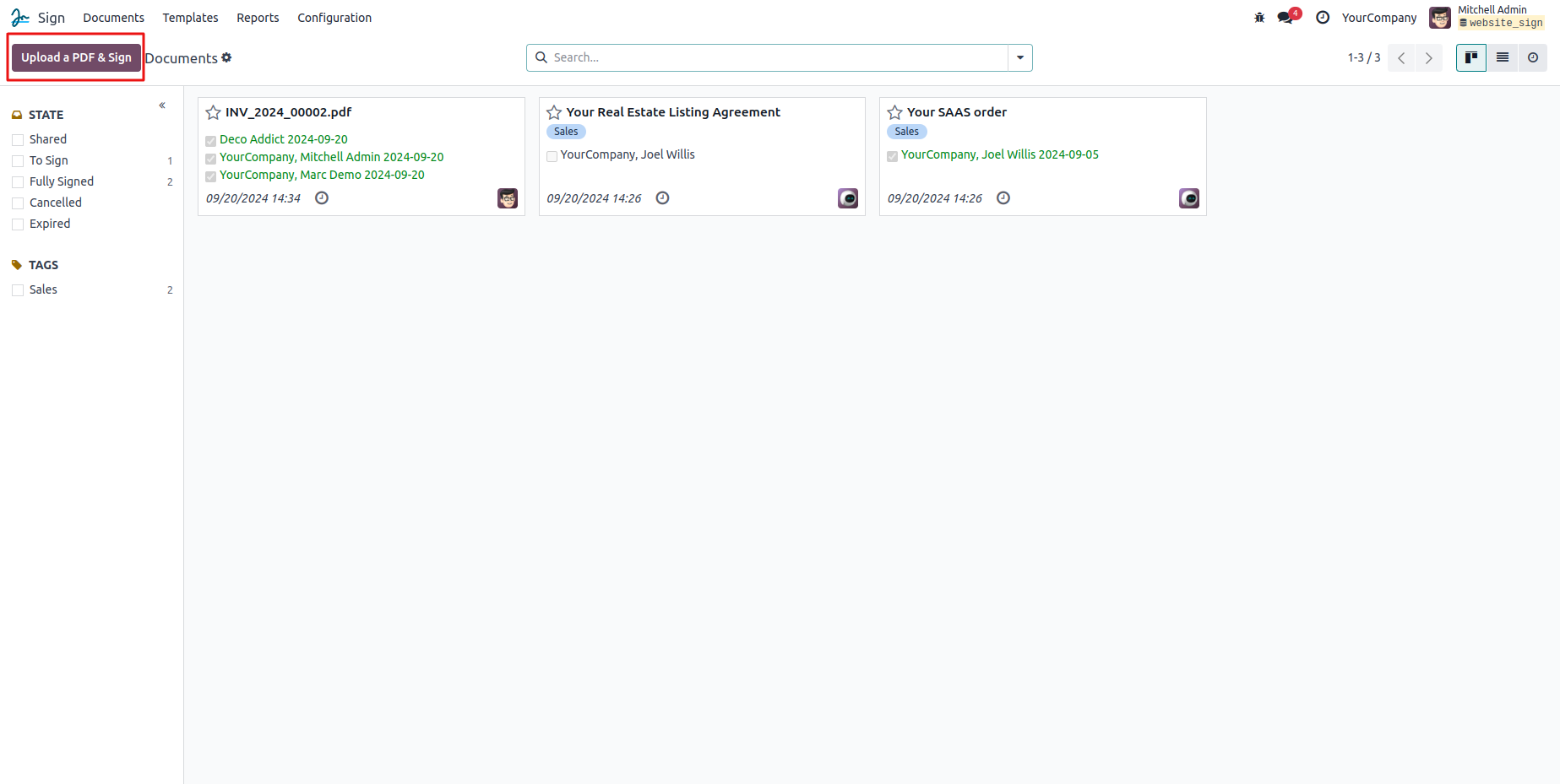 Go to Sign module -> Click the UPLOAD A PDF TO SIGN -> Then upload to a document.