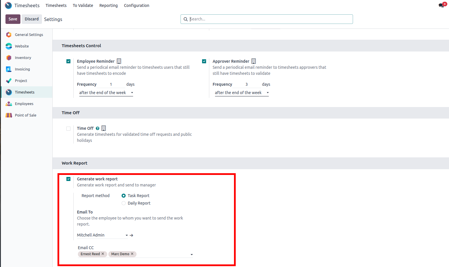 On enabling 'Generate work report' from the configuration user can choose the employee to whom user want to send the Work Report.
