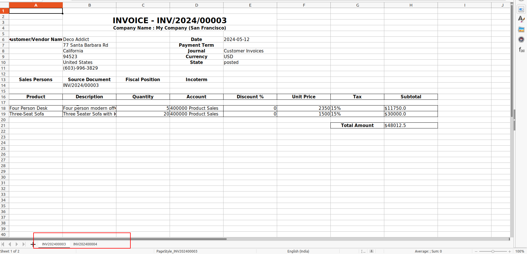 By clicking the Account Invoice Excel Report button we can print the Excel report