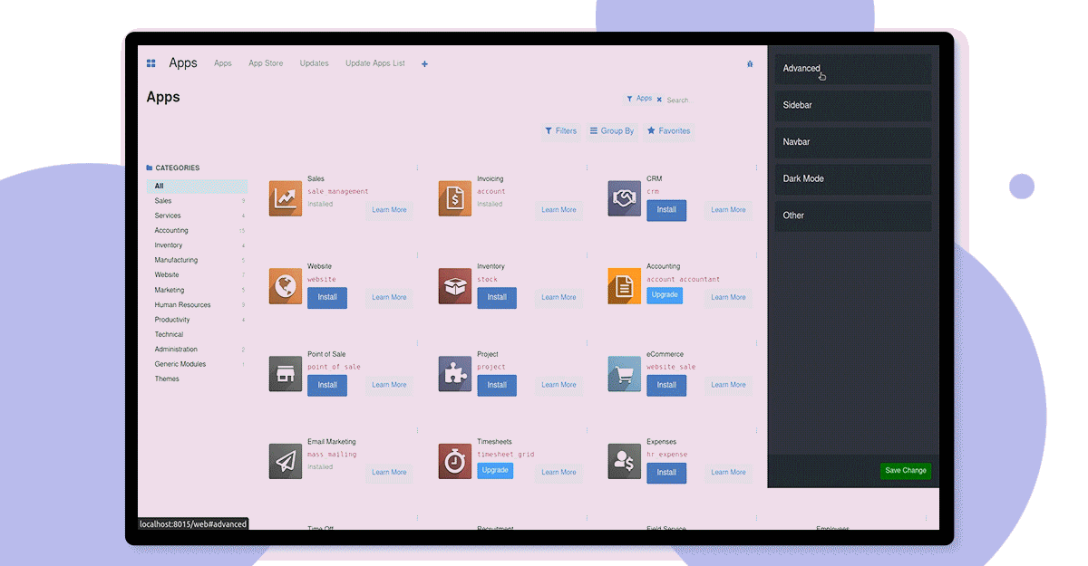 The Backend Theme Infinito Is A Dynamic And Ultimate Theme For Your Odoo V17. This Theme Will Give You A New Experience With Odoo. Main Highlight Of The Theme Is You Can Dynamically Change The Colors, Views, Buttons, Different Types Sidebar...Etc. Moreover It Act As A Studio Based Theme. It Also Provides Dark Mode With 3 Configuration, Recent Apps, Menu Bookmark And It Supports RTL. It Is A Perfect Choice For Your Odoo Backend And An Attractive Theme For Your Odoo 17. It Will Give You A Clean Layout With A New Color Combination. It Has A Sidebar With New App Icons, Company Logo And User Menu. This Will Change Your Old Kanban, List And Form Views To A Fully Modified View And Infinto Provides You A Full Screen App Bar With User Image And Greetings.
