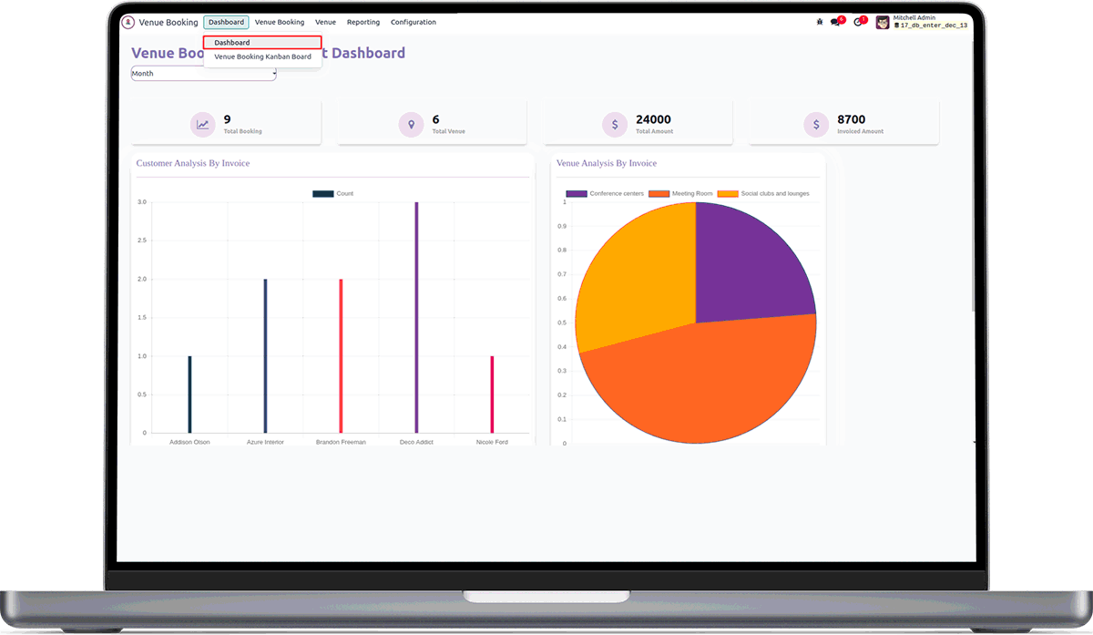 Venue related order count is visible and can see the Booking related to each Venue type on clicking the type from Dashboard. Also gives the top level venue, customer information and the Booking information with the Dashboard.