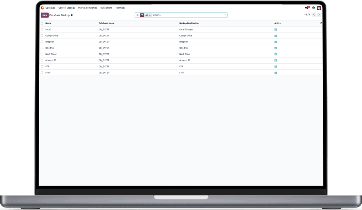 Go to Setting --> Technical --> Backup Configuration to configure backups.