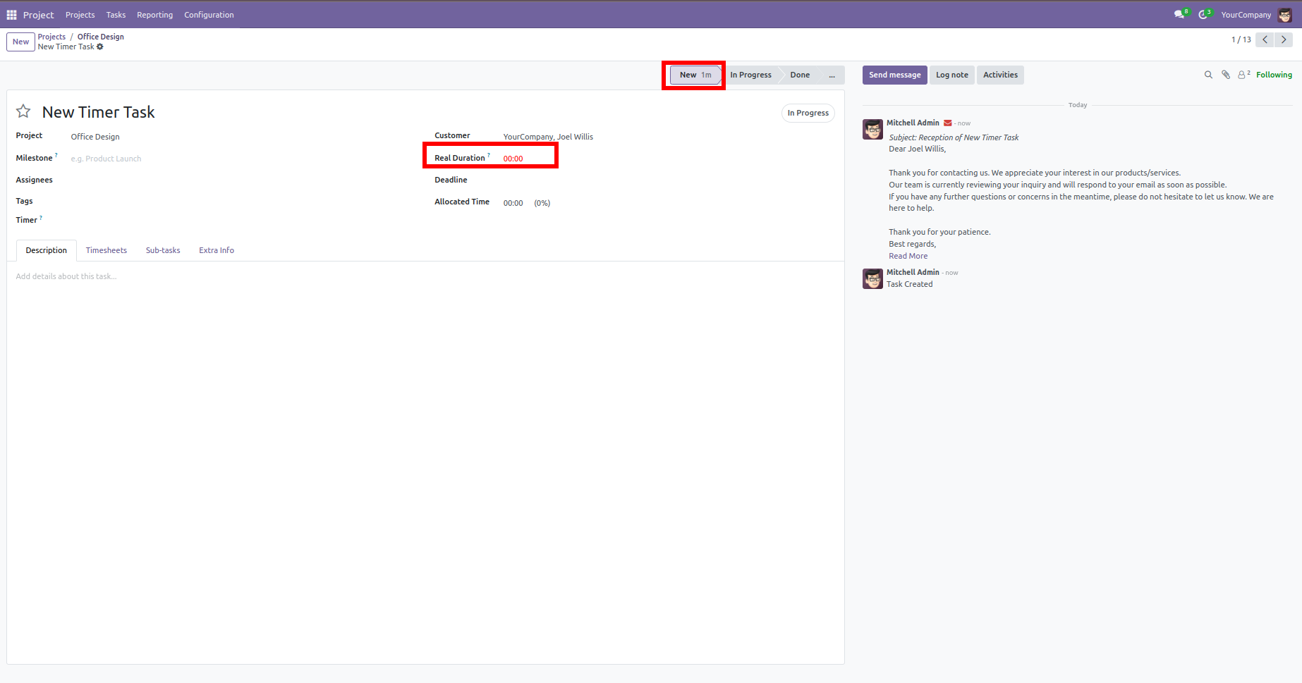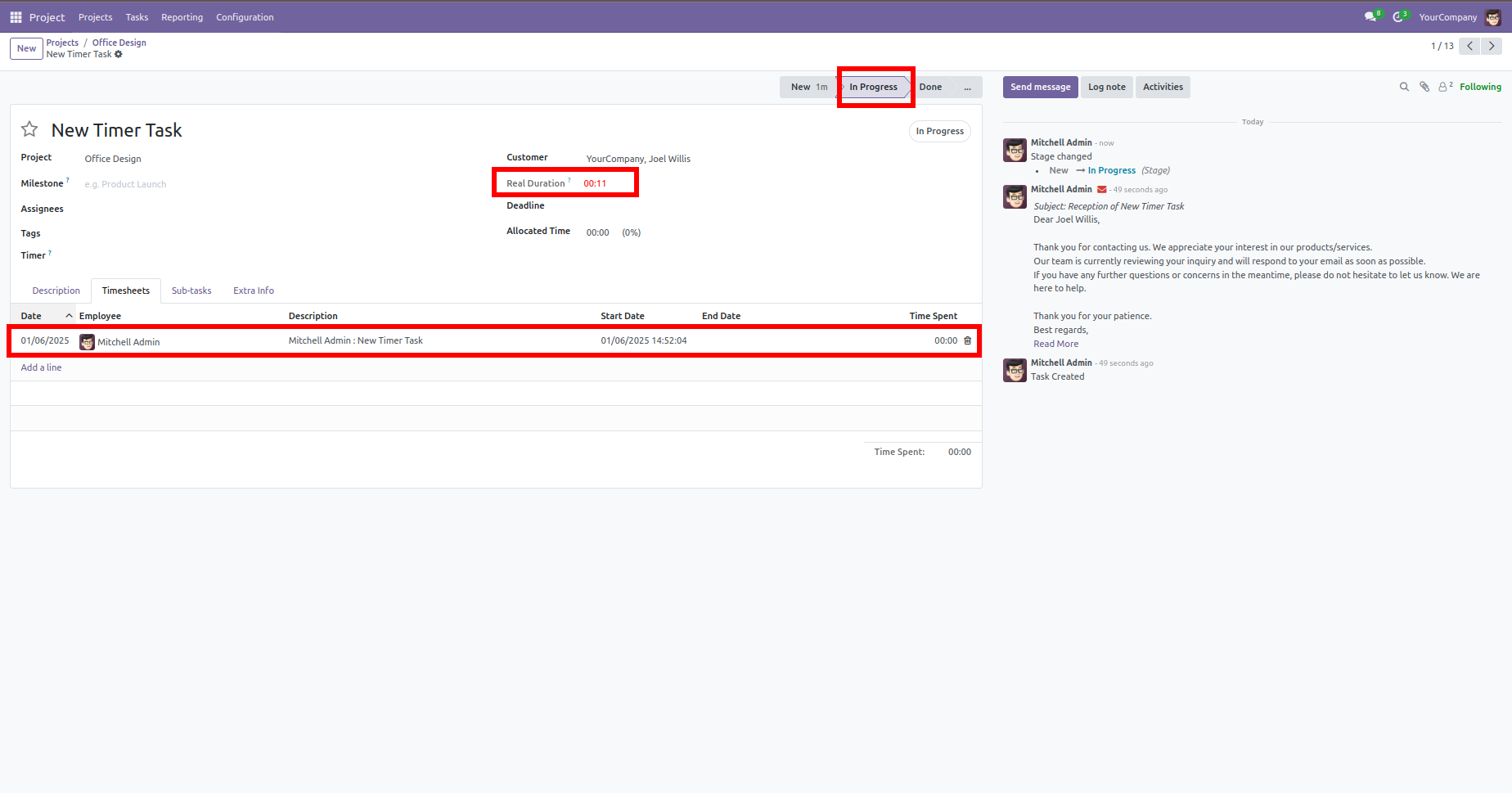 A real duration field will be seen on the timesheet page. In the other stages the timer won't be run, and also timesheet not be recorded.