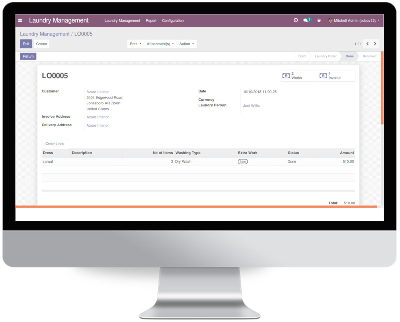 can create Laundry Order via clicking the 'Create' button. There you can specify the customer, laundry person,