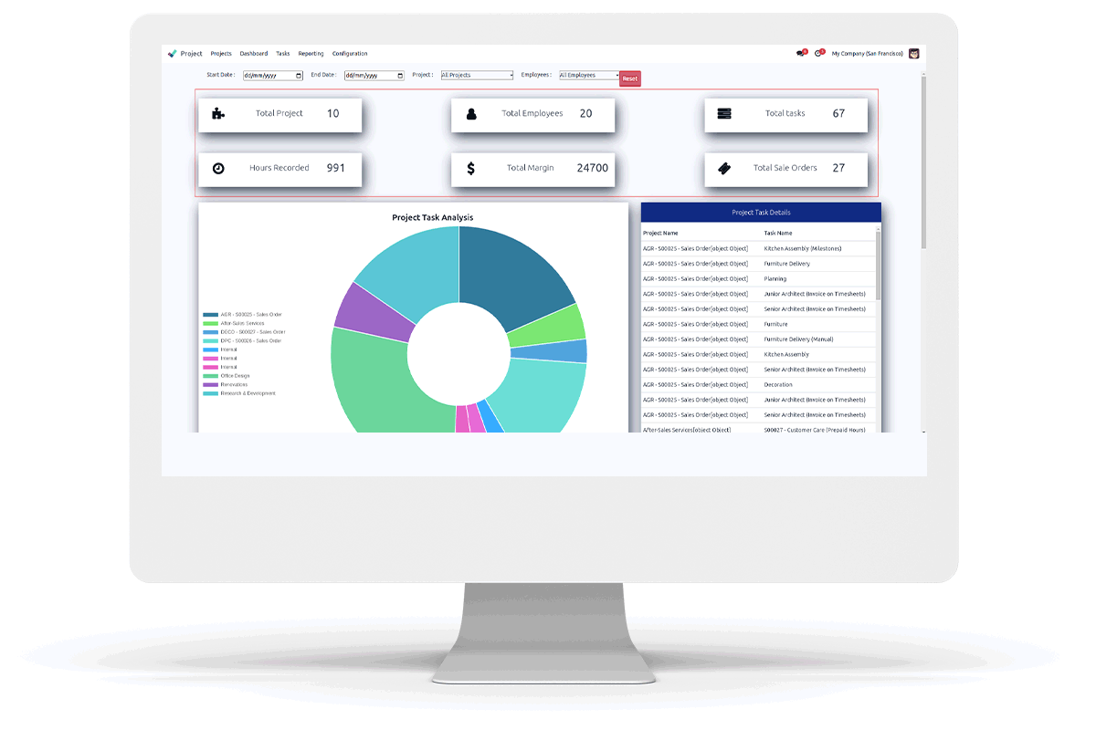Project Dashboard has different types of Graphs that will give you a complete analyzing of the Project module.