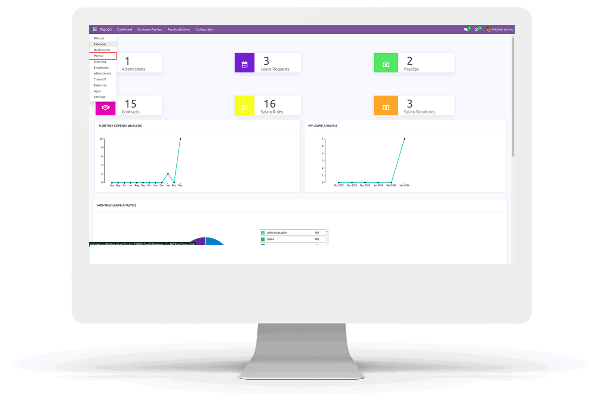 The Tiles display a list of the Attendance orders,Leaves, Payslips,Contracts,Salary Rules, and Salary Structures.