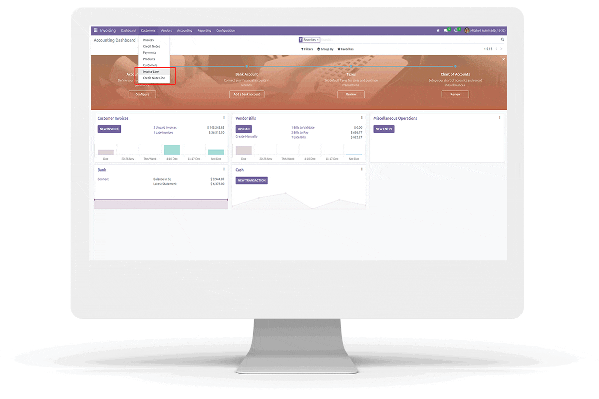 Go to invoicing -> Accounting -> -> We can see the Account Line and menu