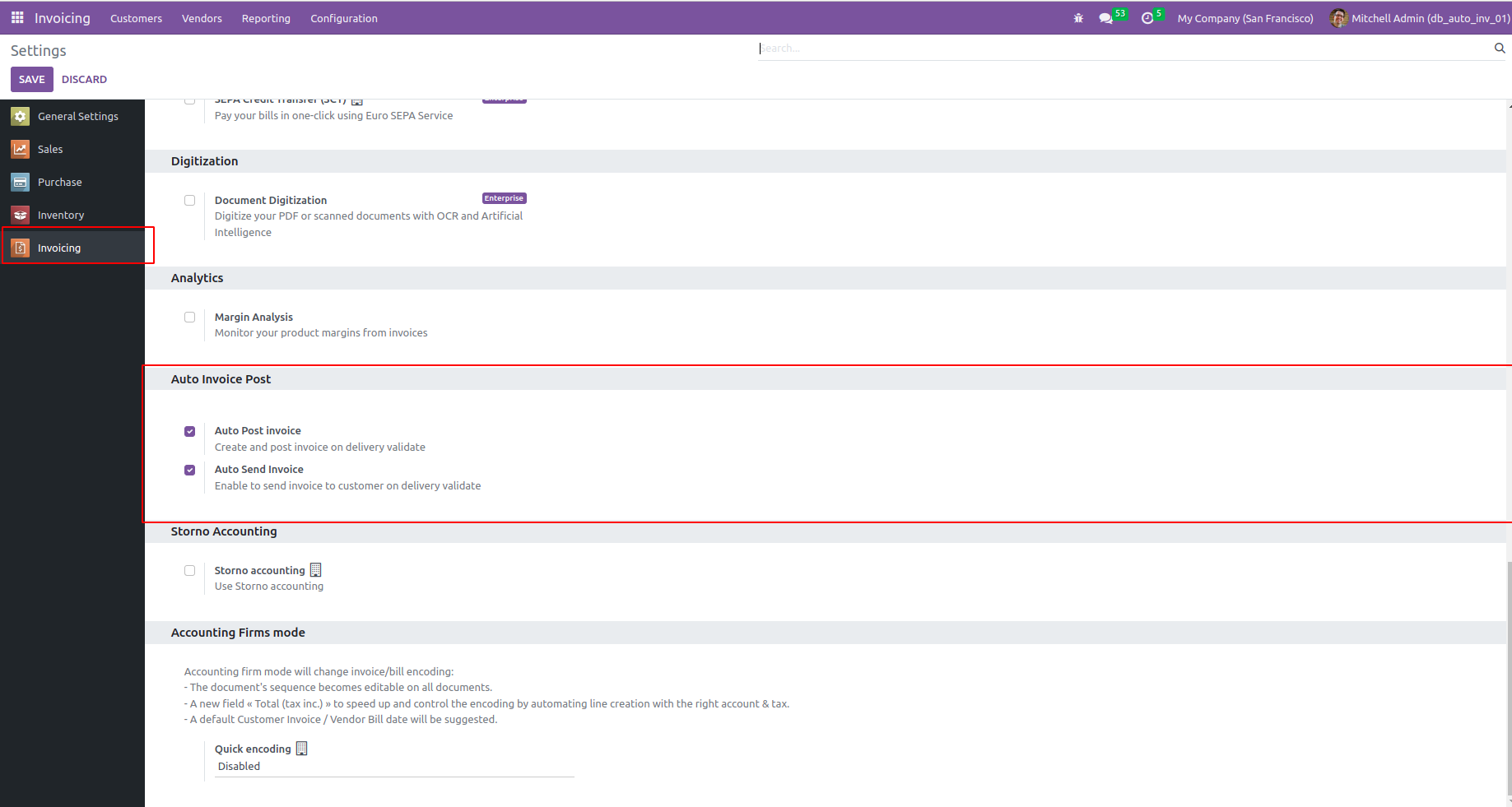 This module generates and post invoice while validating the delivery.Auto send invoice by Email when Delivery is Done. Whenever Delivery order is done this module creates customer invoice automatically same as sales order product price with delivered quantity. If you enable automatic invoice post When delivery gets done it automatically creates a customer invoice and post it automatically.