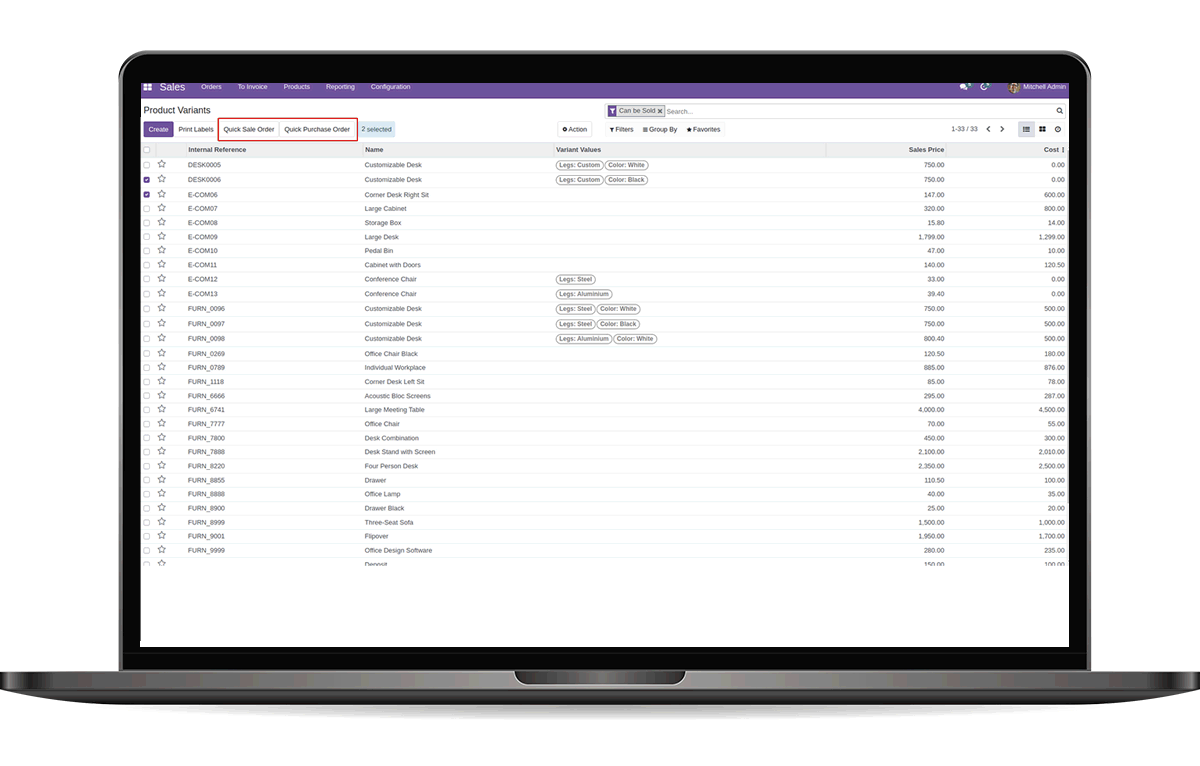 This module helps to created/ update the sale or purchase orders by the selected products variants