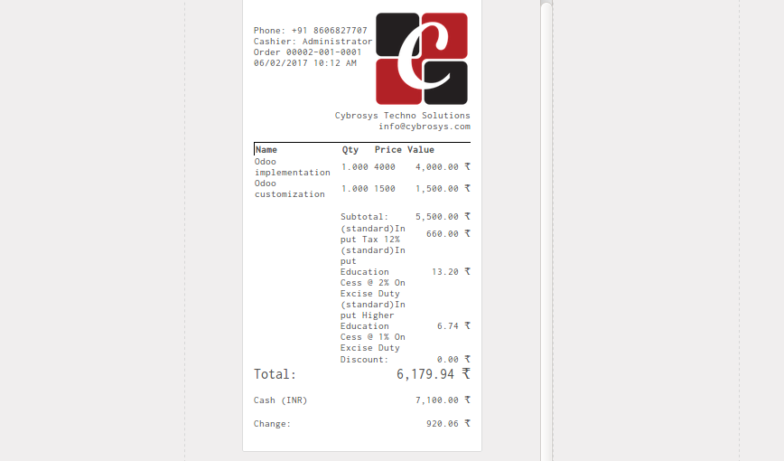 Currently in Odoo POS receipt there is no company logo. This module adds the company logo to the POS receipt so that the users will get more information about the company from the receipt.