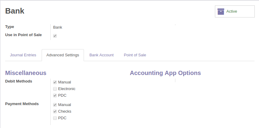 As shown here, You have to select PDC to enable the PDC payment.This is only available with Journal of type 'Bank'
