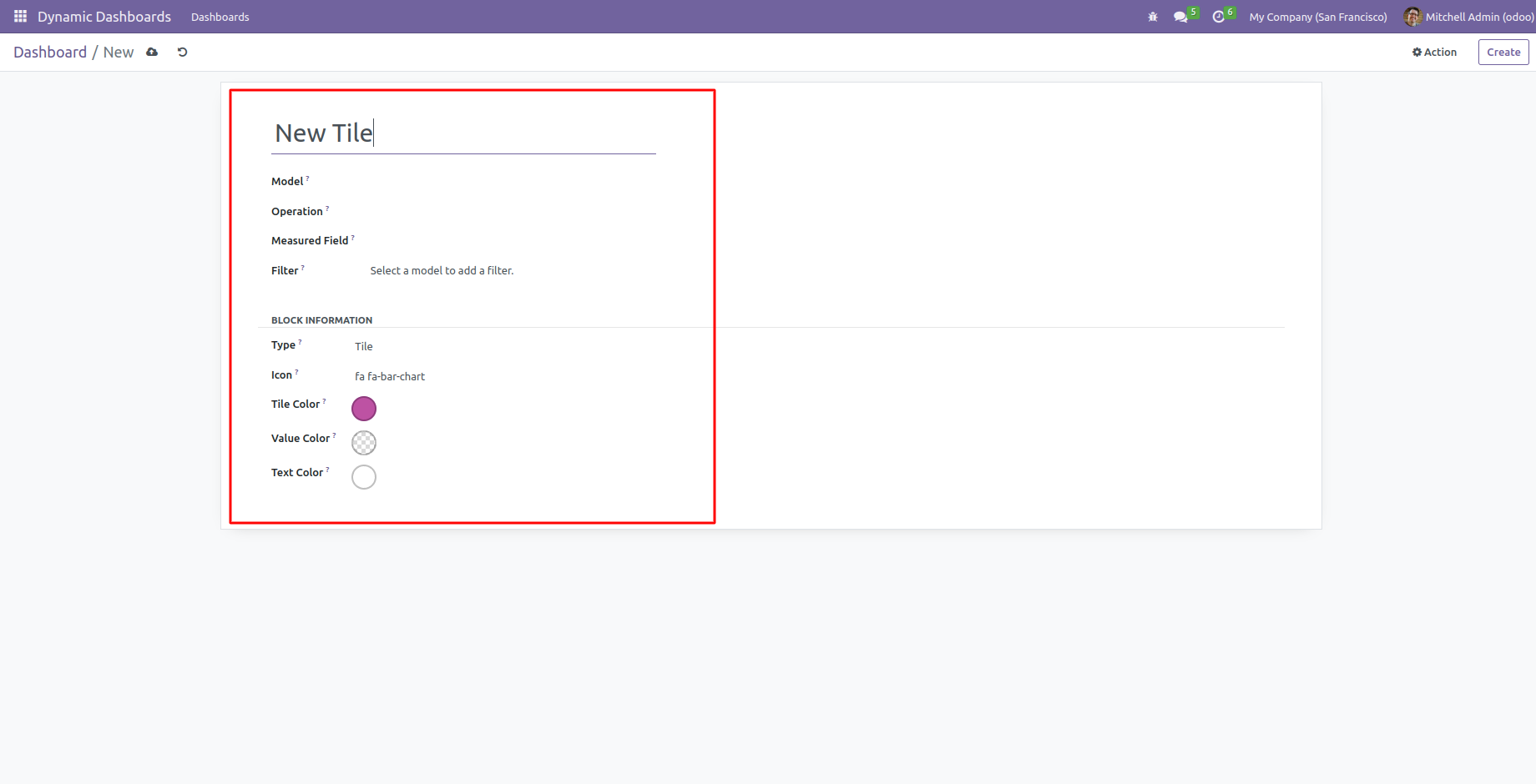 If selected Tile, Add a name for the tile,select model, operation type, measured field. And also set icon and color for the tile.