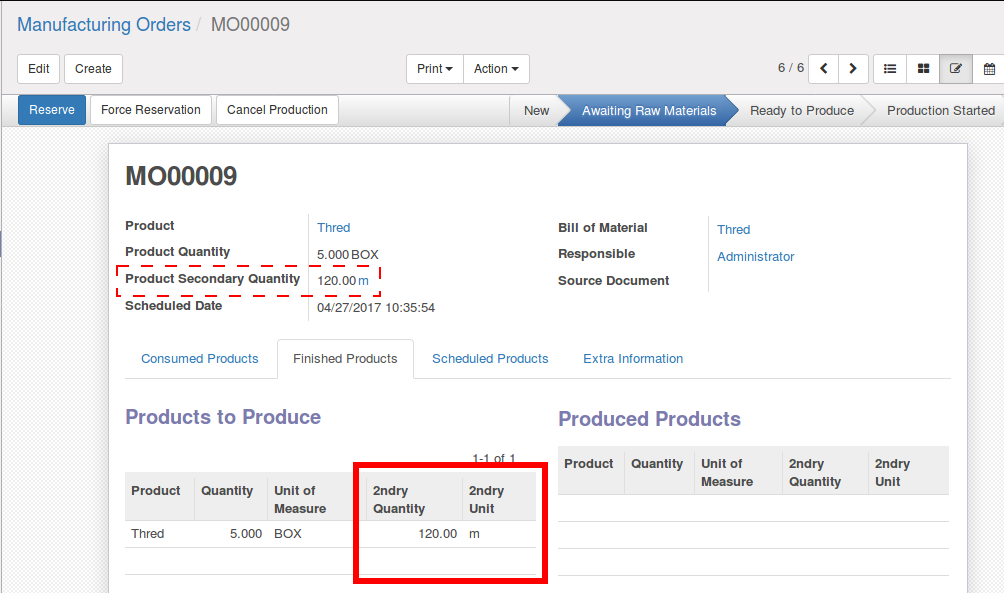 As shown here, When we create a MO with a Primary and Secondary Product Quantities and UOMs. After confirming the MO, MO will change the state to 'Awaiting Raw Materials'. Same time we can see a record created in 'Products to Produce' with secondary UoM.