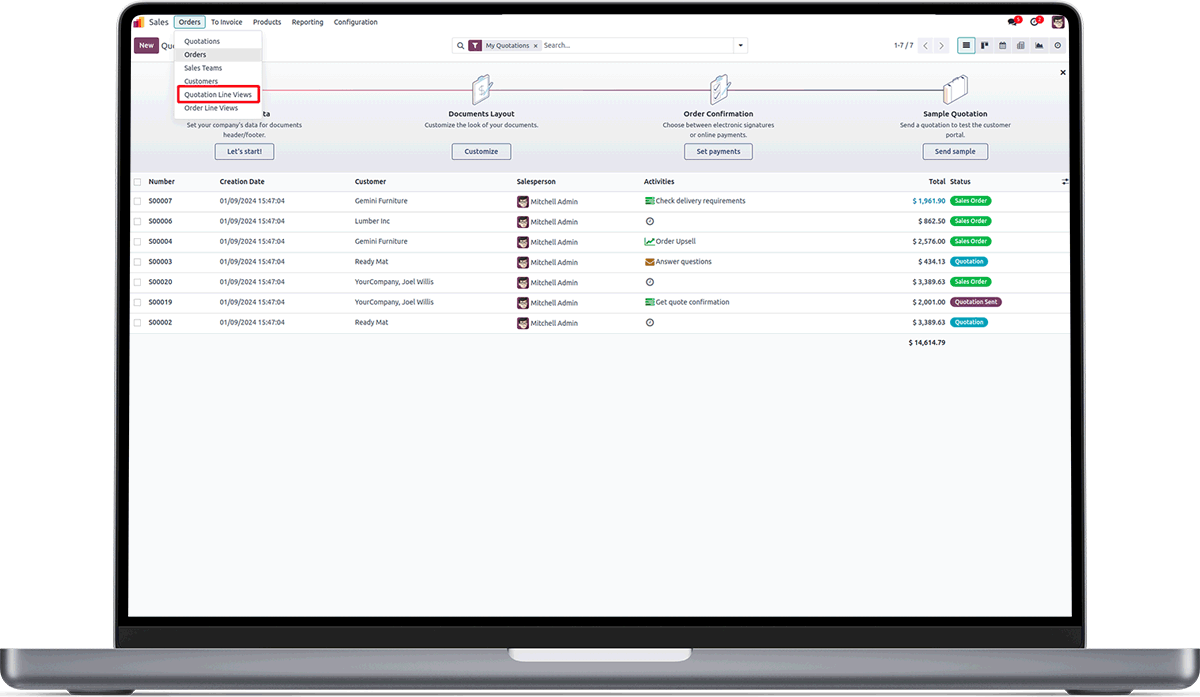 Sale order/quotation details can be viewed in different views like, list view,form view, kanban view, search view, pivot view, graph view and calendar view.