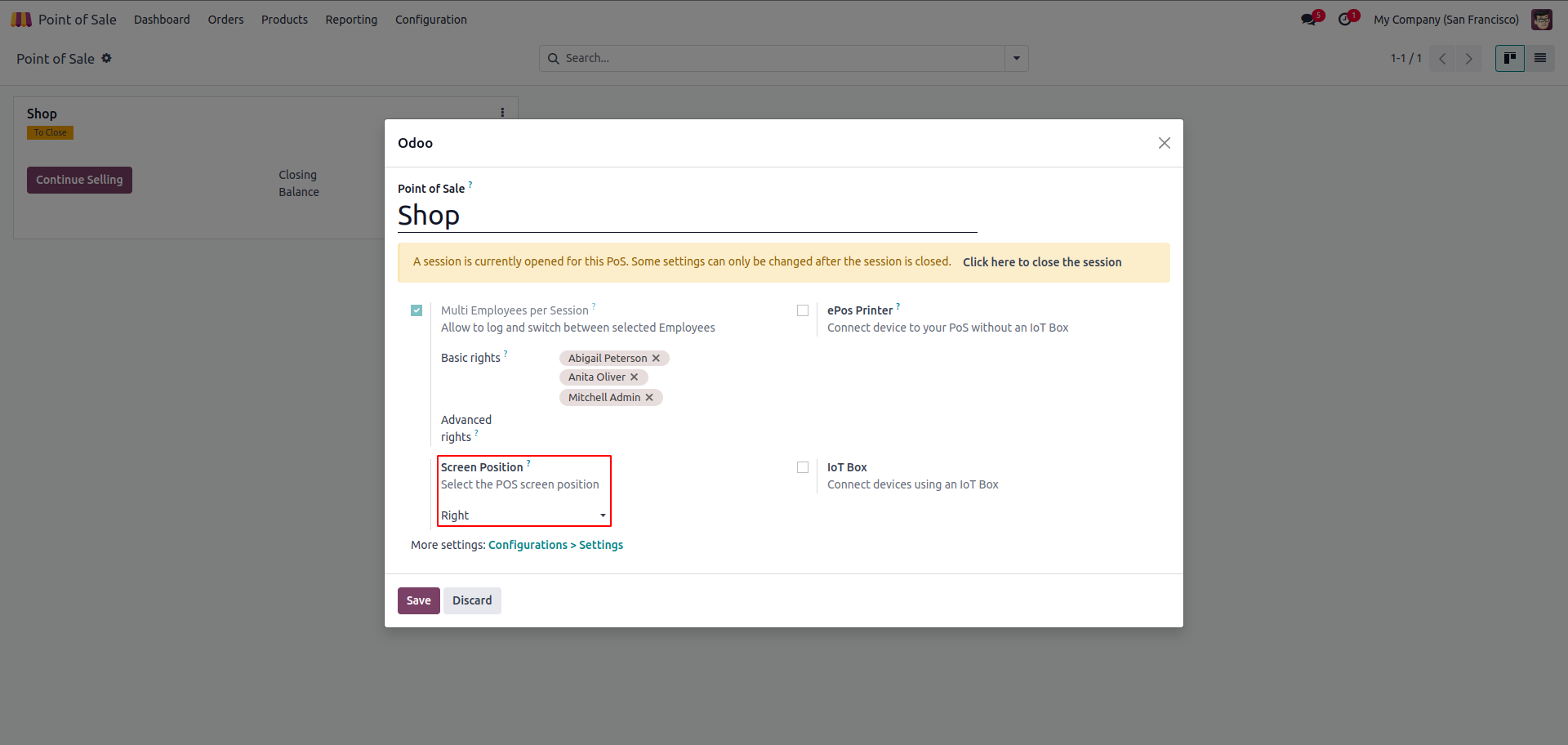 When we clicked the Edit button it will redirect to session settings, and here we can set the position of the screens. If the position is Right we can see the order screen on Right.