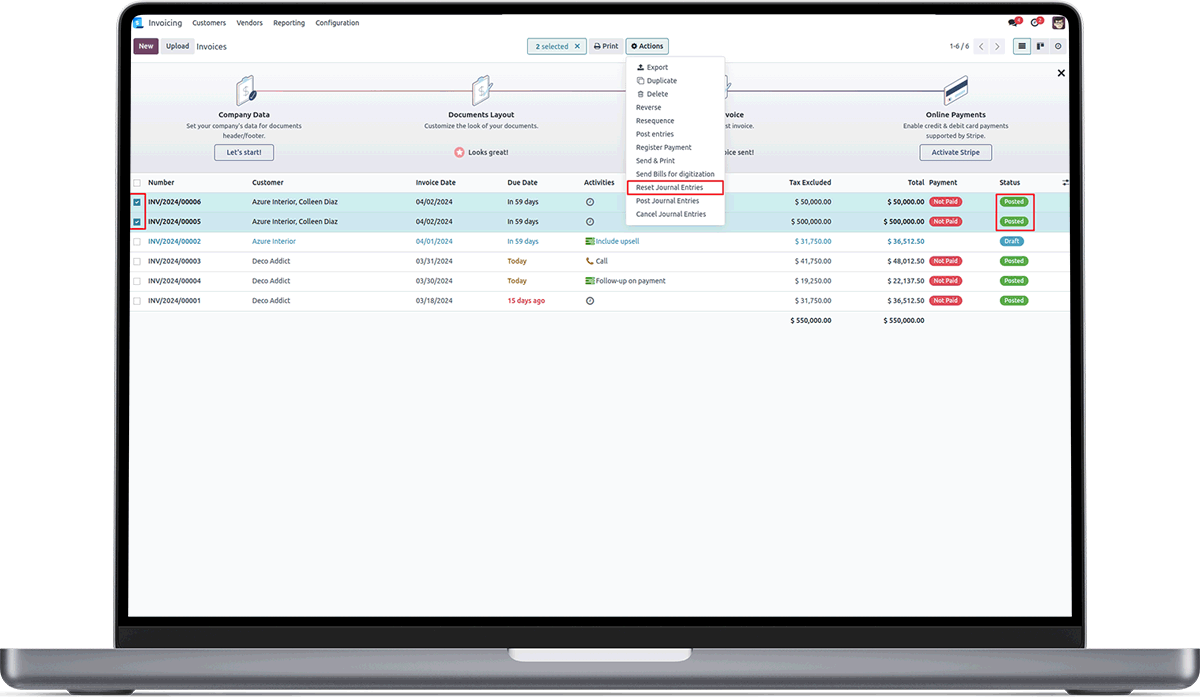 Multiple Journal Entries can be set to Draft, Cancelled and Reposted in Accounting.