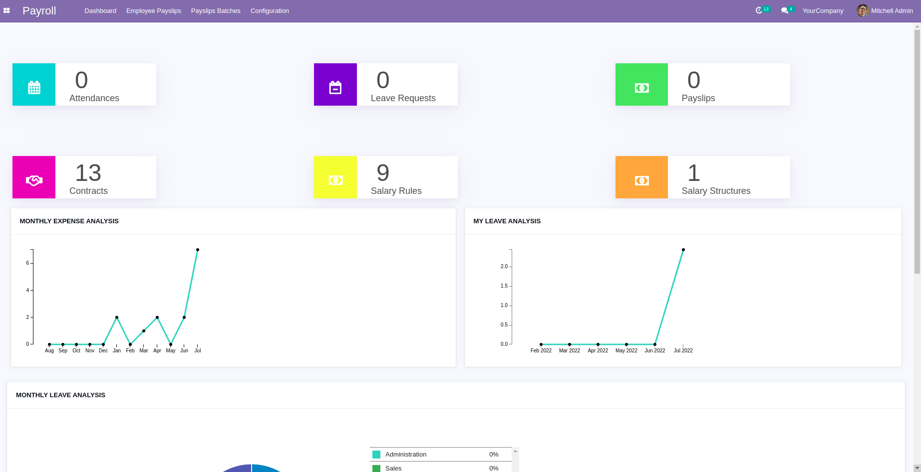 This module helps you to see the Overview of Payroll, here You can see the details of Attendance, Leaves, Payslip contracts, etc.