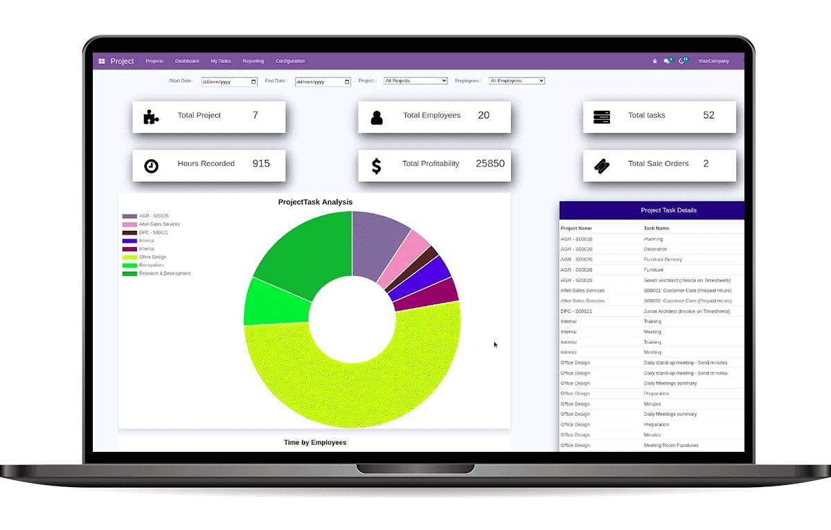 This module helps you to see the Overview of Project, here You can see the task, Employees, Timesheet, etc