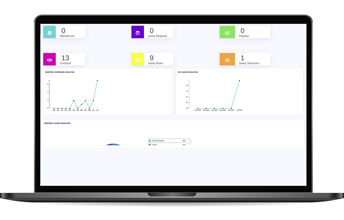 This module helps you to see the Overview of Payroll, here You can see the details of Attendance, Leaves, Payslip contracts, etc.