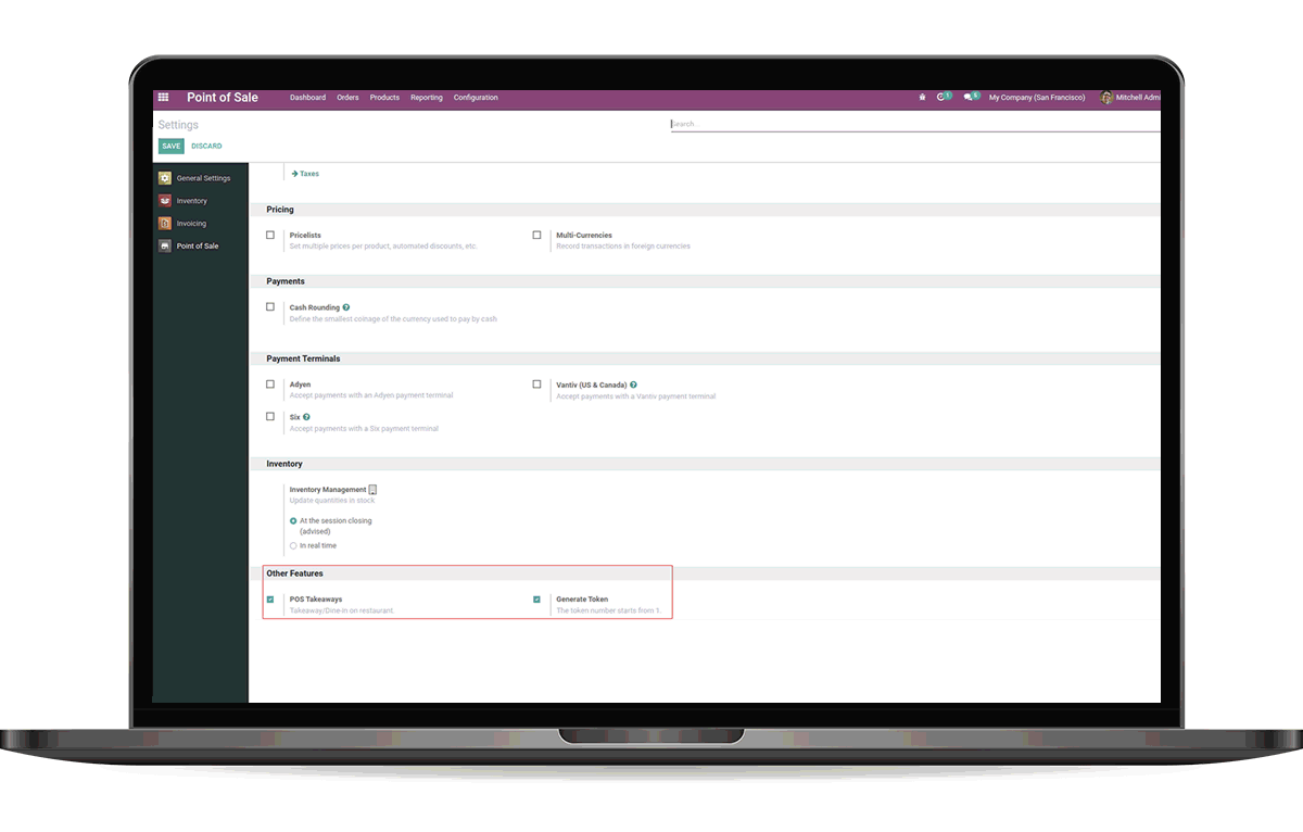 You can enable the Take-away feature from the boolean field in POS configuration settings. Also, you can enable the feature of tokens from here.
