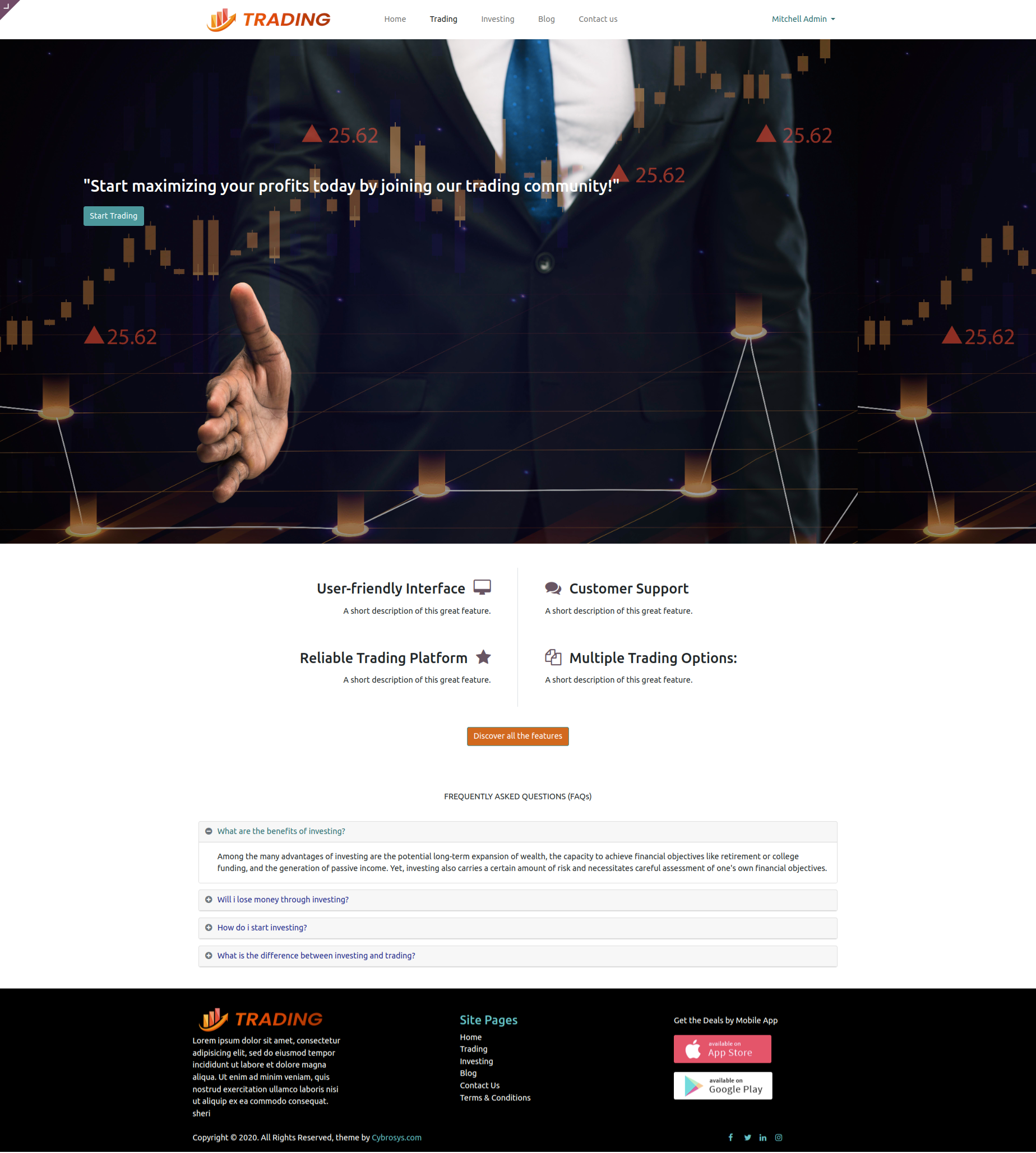 Theme Trading is a simple and elegant theme for your odoo trading website. It is easy to customize and use. It comes with customizable snippets that can be dragged and dropped to make attractive webpages. Simple and stylish header, footer and page banners.