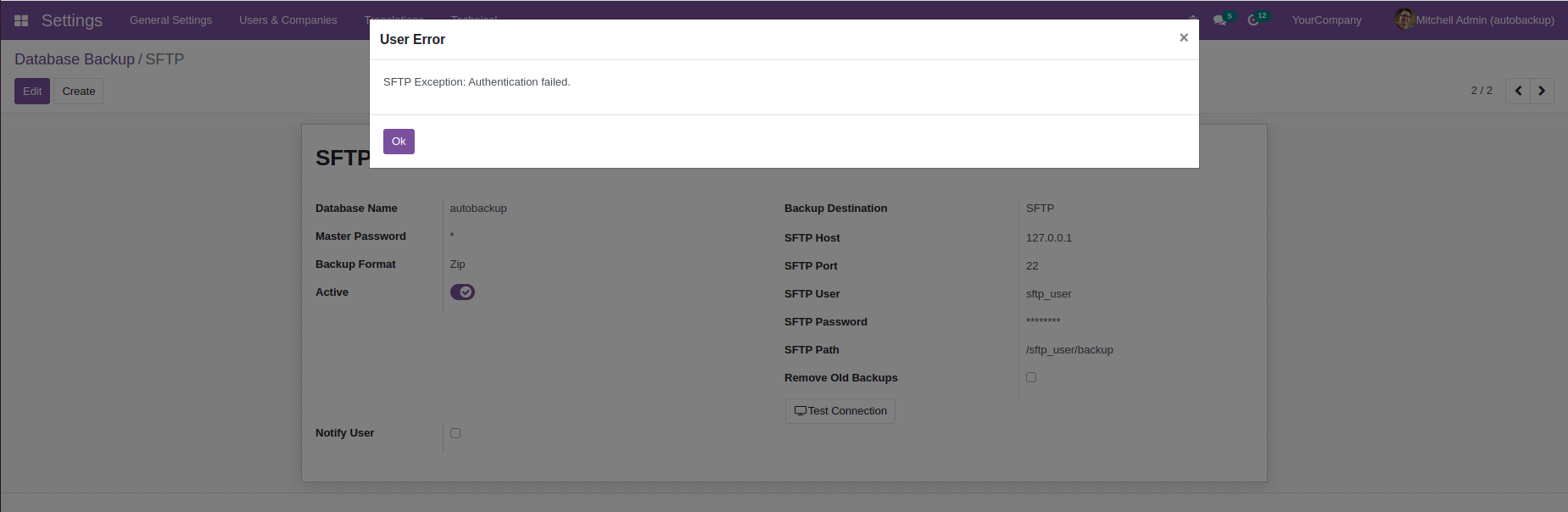 Select backup destination as SFTP, enter credentials. Test connection button to check whether the connection is successful.