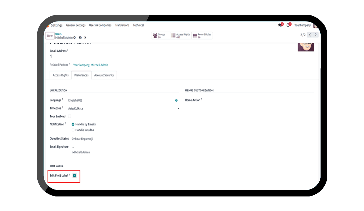 Go to Settings --> Users & Companies --> Users and enable Edit Field Label