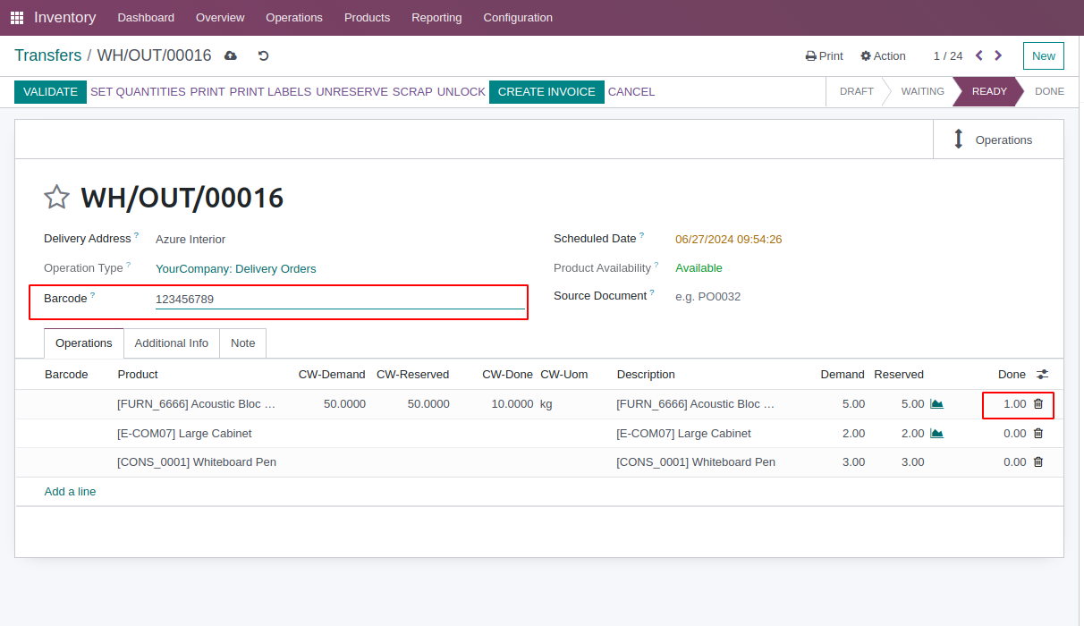 Enable the edit mode, Click the field 'Barcode' and scan the product. Now you can see the quantity is automatically Updated.
