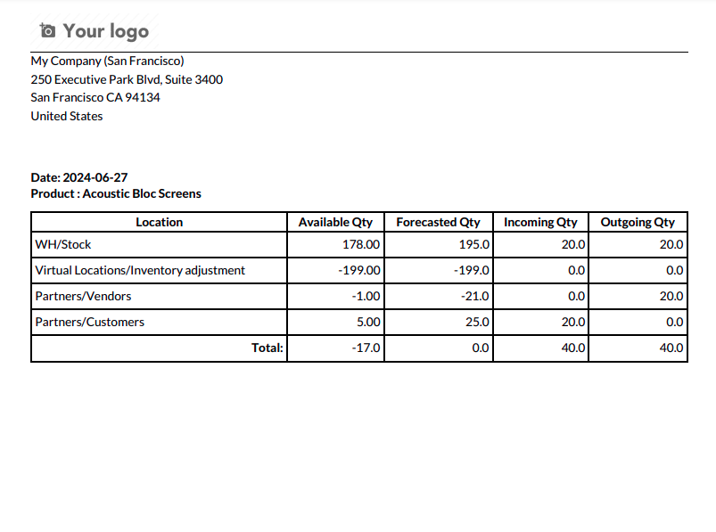 Get product quantity reviews for each stock location from the product form and Print PDF report of them