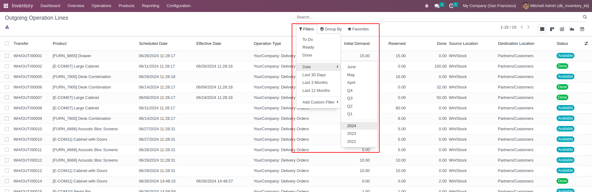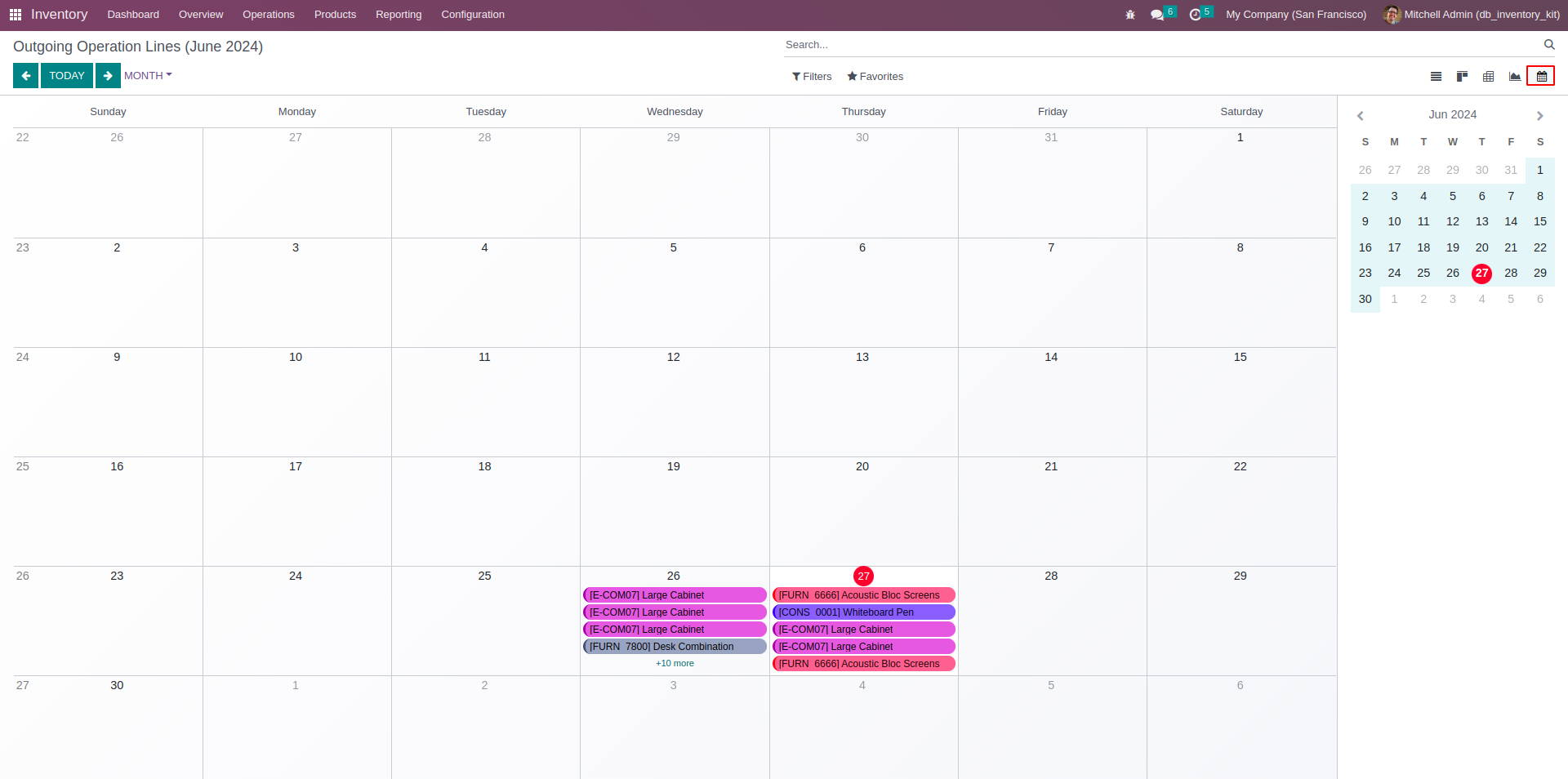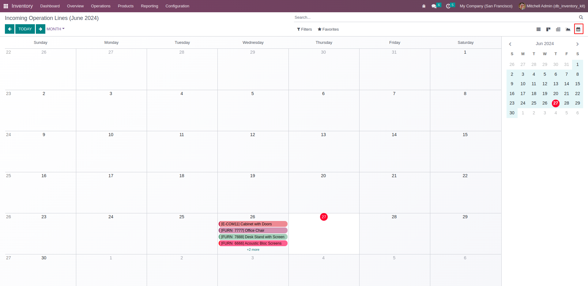 Form, Tree, Kanban, Pivot, Graph and Calendar views of Incoming and Outgoing Picking Operations