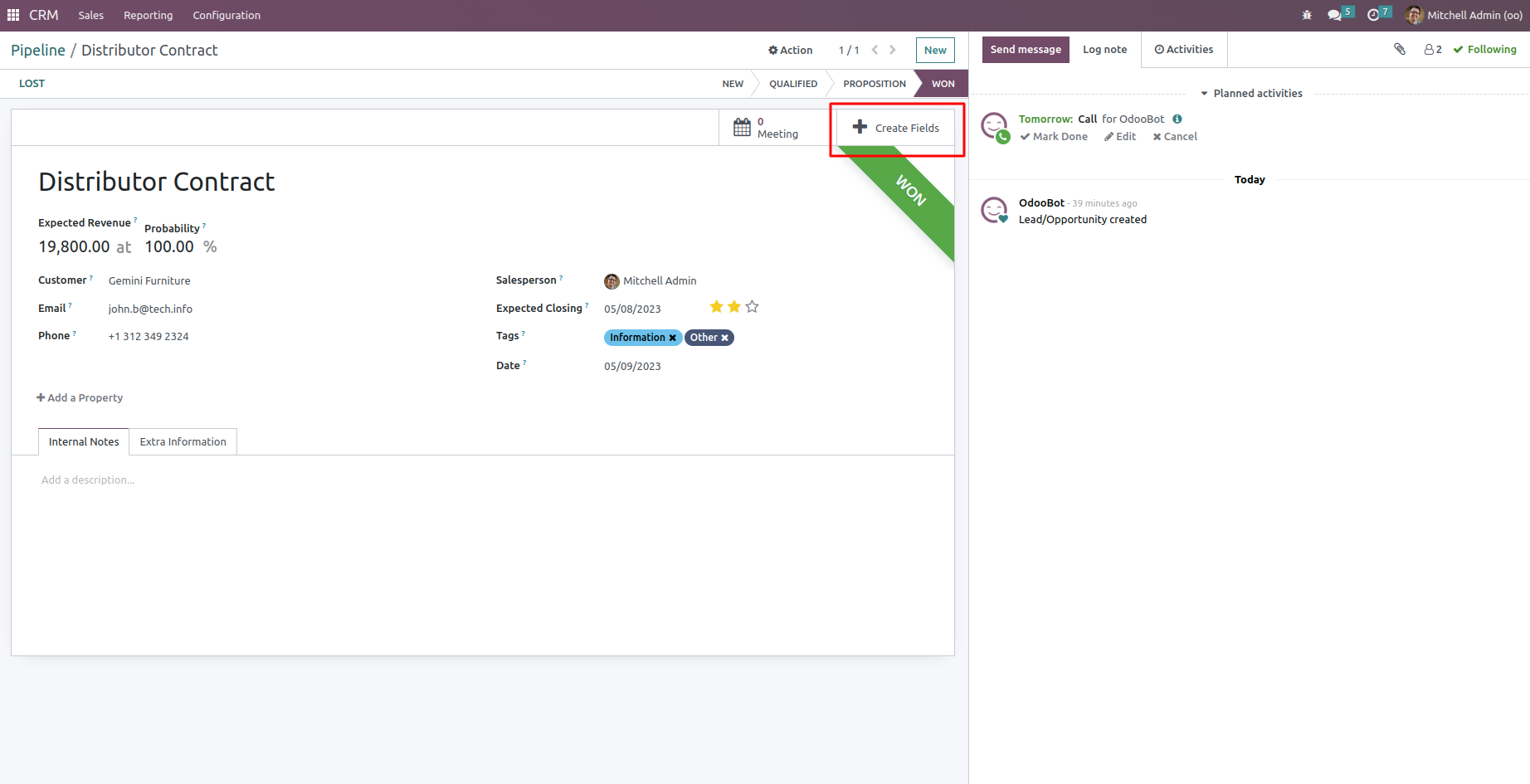Go to CRM. Now a "Create Fields" smart button will appear on form view