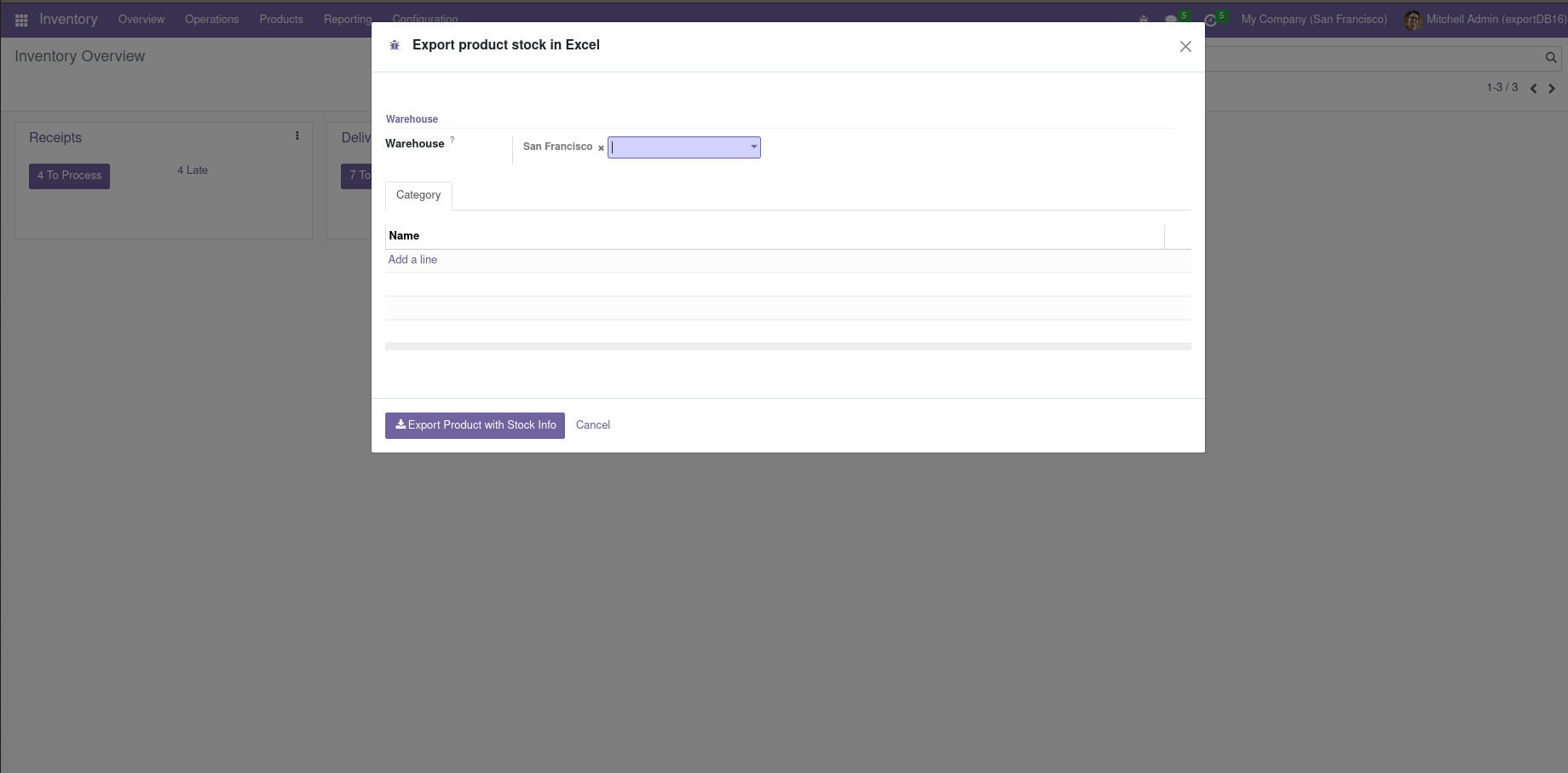 Go to Inventory -> Reports -> Current stock in Excel. Now a wizard will appear on your screen. Please enter the warehouses which you want to take the report. You can also select category for products(It is Optional). Then Click "Export Product with Stock Info" button. Then You will get the corresponding report in XLS.