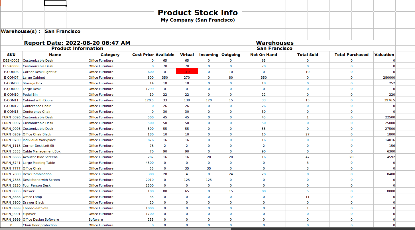 Per warehouse you can get Available Qty, Virtual Qty, Incoming Qty, Outgoing Qty, Net On Hand Qty, Total Sold & Total Purchased Qty. You can get your stock valuation details too. Negative stock will be highlighted in "red" cells.