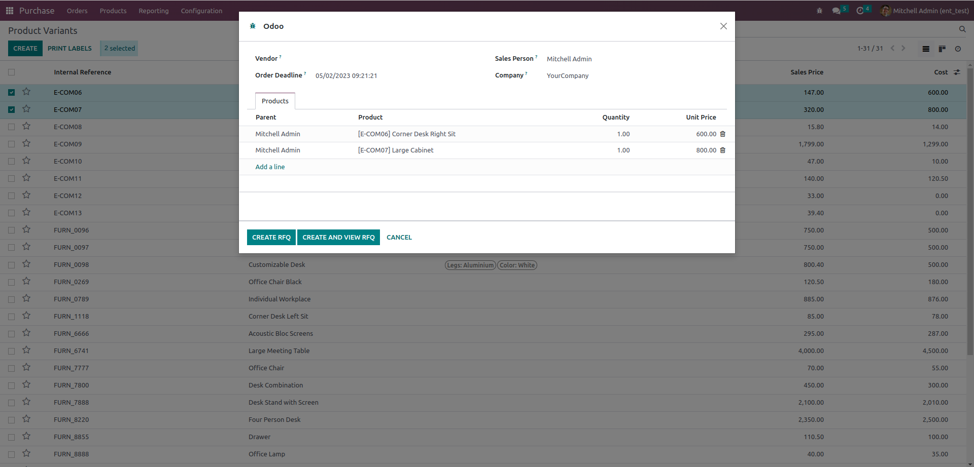 Added Create RFQ option inside Action button of Products Variants list