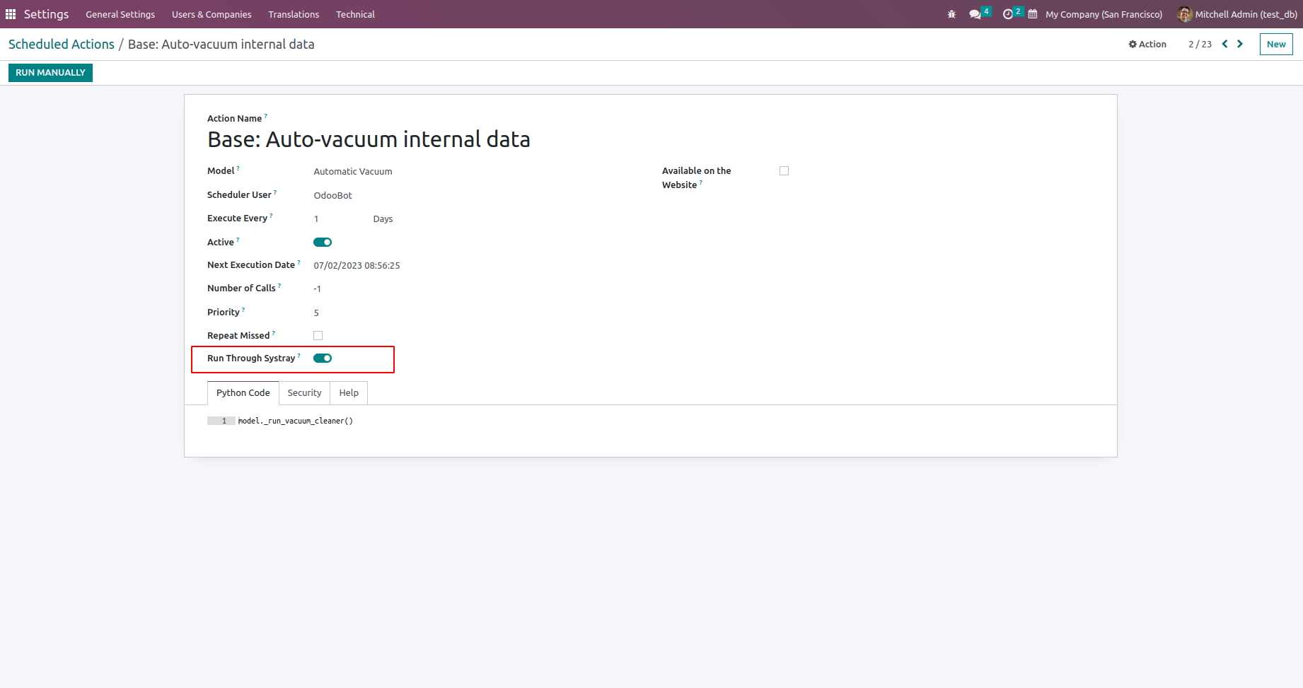 Enable the boolean field to run scheduled actions through systray, Only enabled scheduled action are shown on the systray