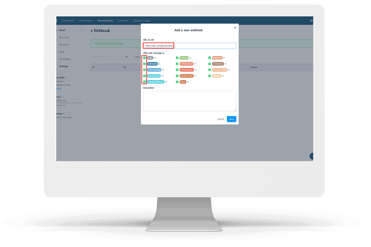 Sendinblue --> Transactional --> Setting -->Webhook --> Add a new webhook