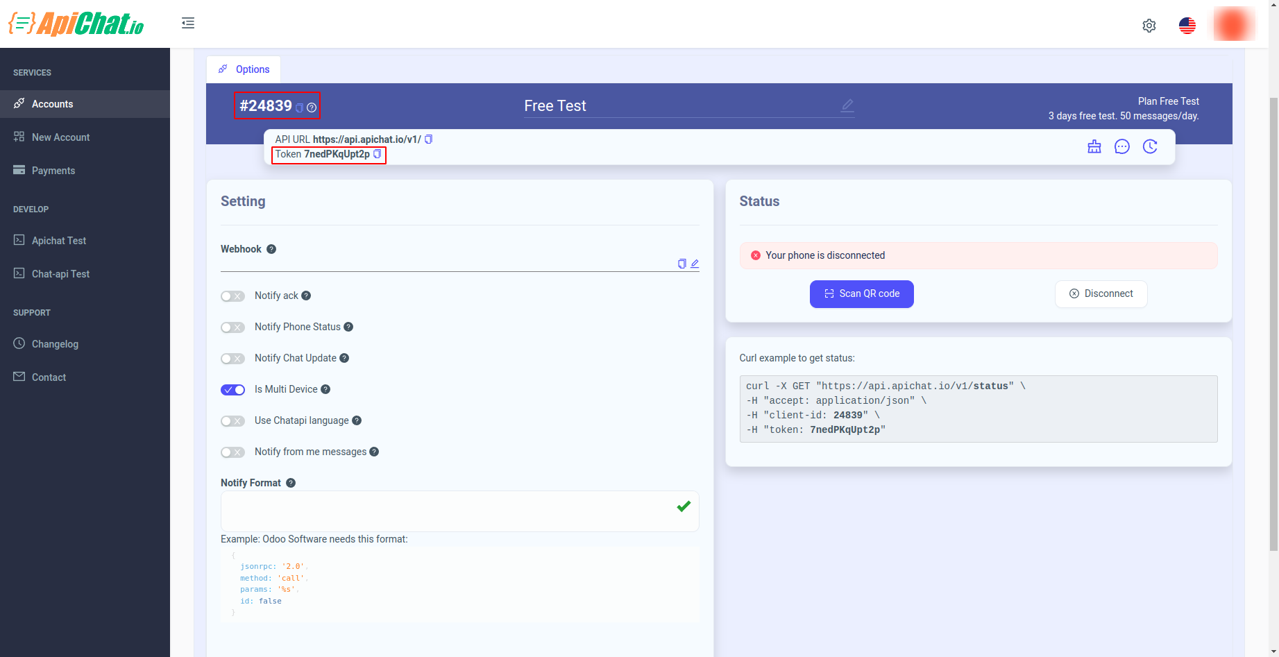 Create an account in https://panel.apichat.io/app/accounts.Then take token and instance.