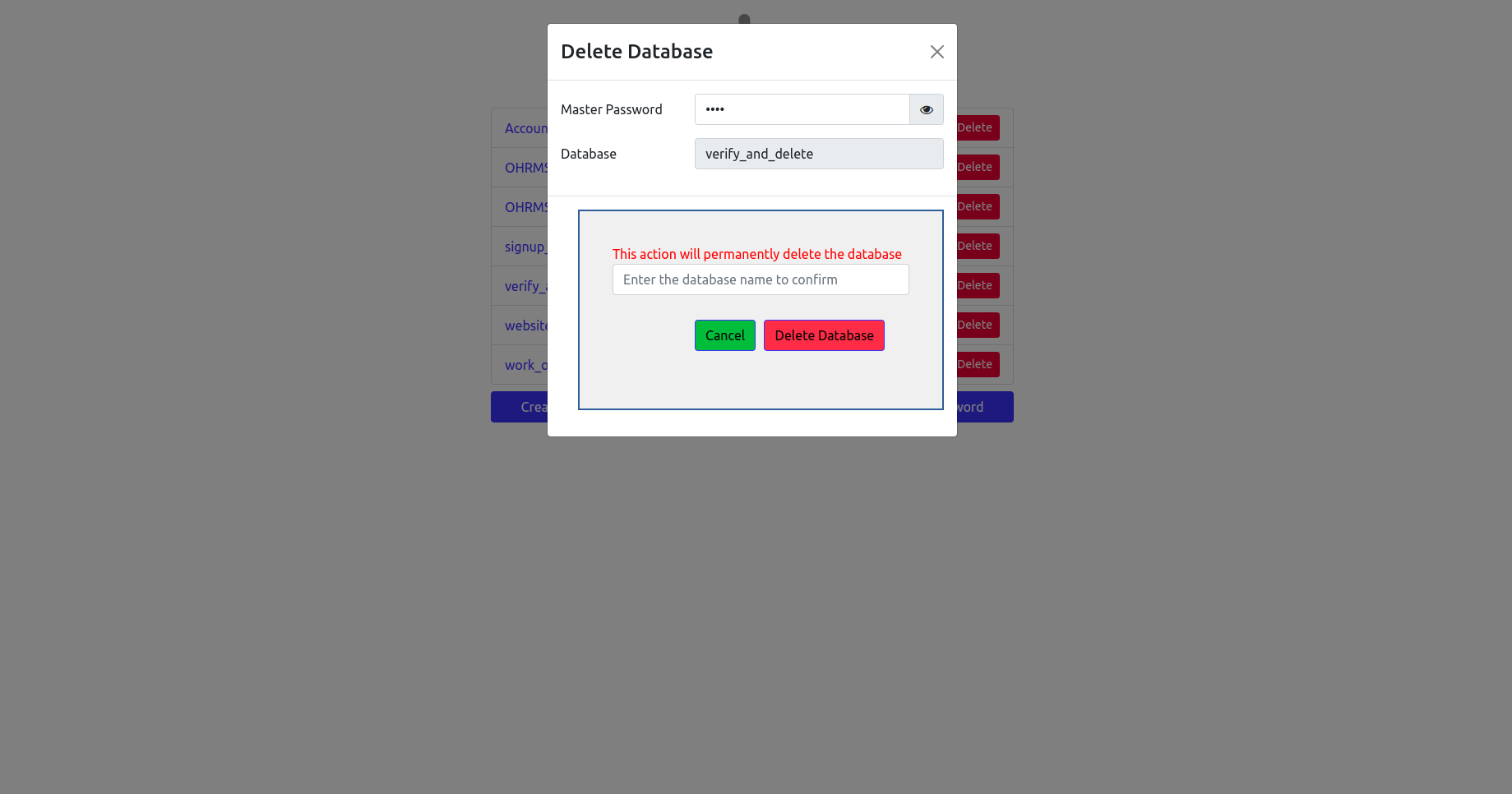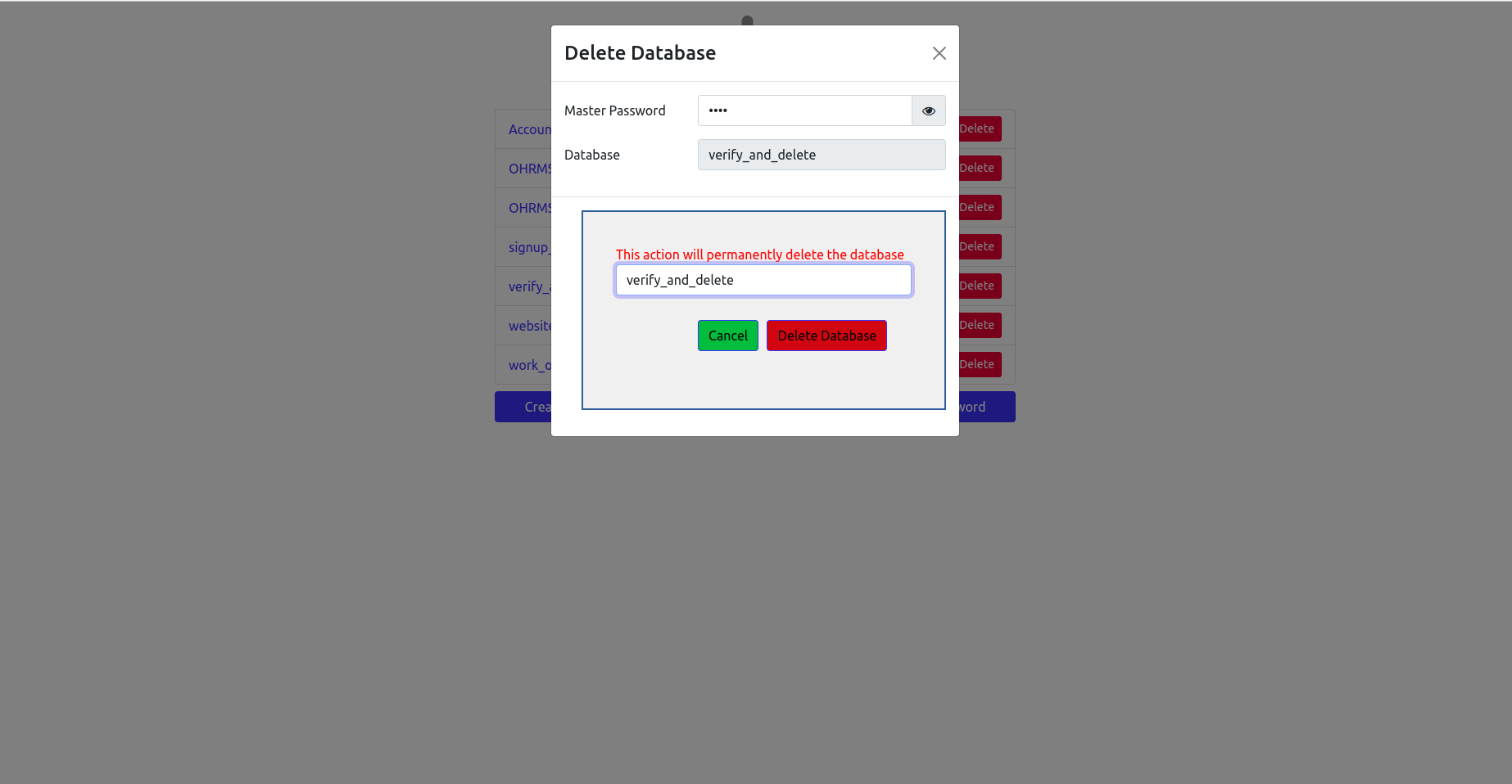 While we click on the delete button, a verification prompt will be displayed. Enter the name of the database you want to delete.