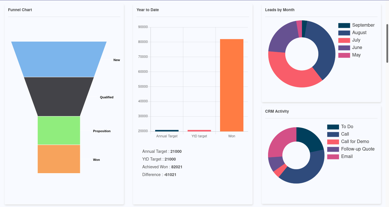 Funnel chart and Year to Date chart helps to understand the target. Also have the pie chart for lead analysis by month and activity.