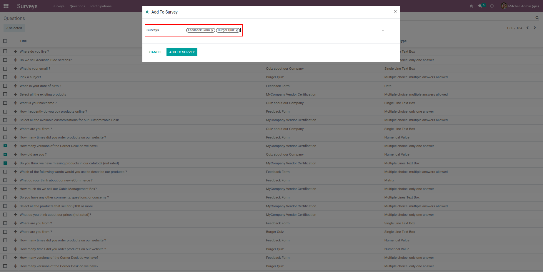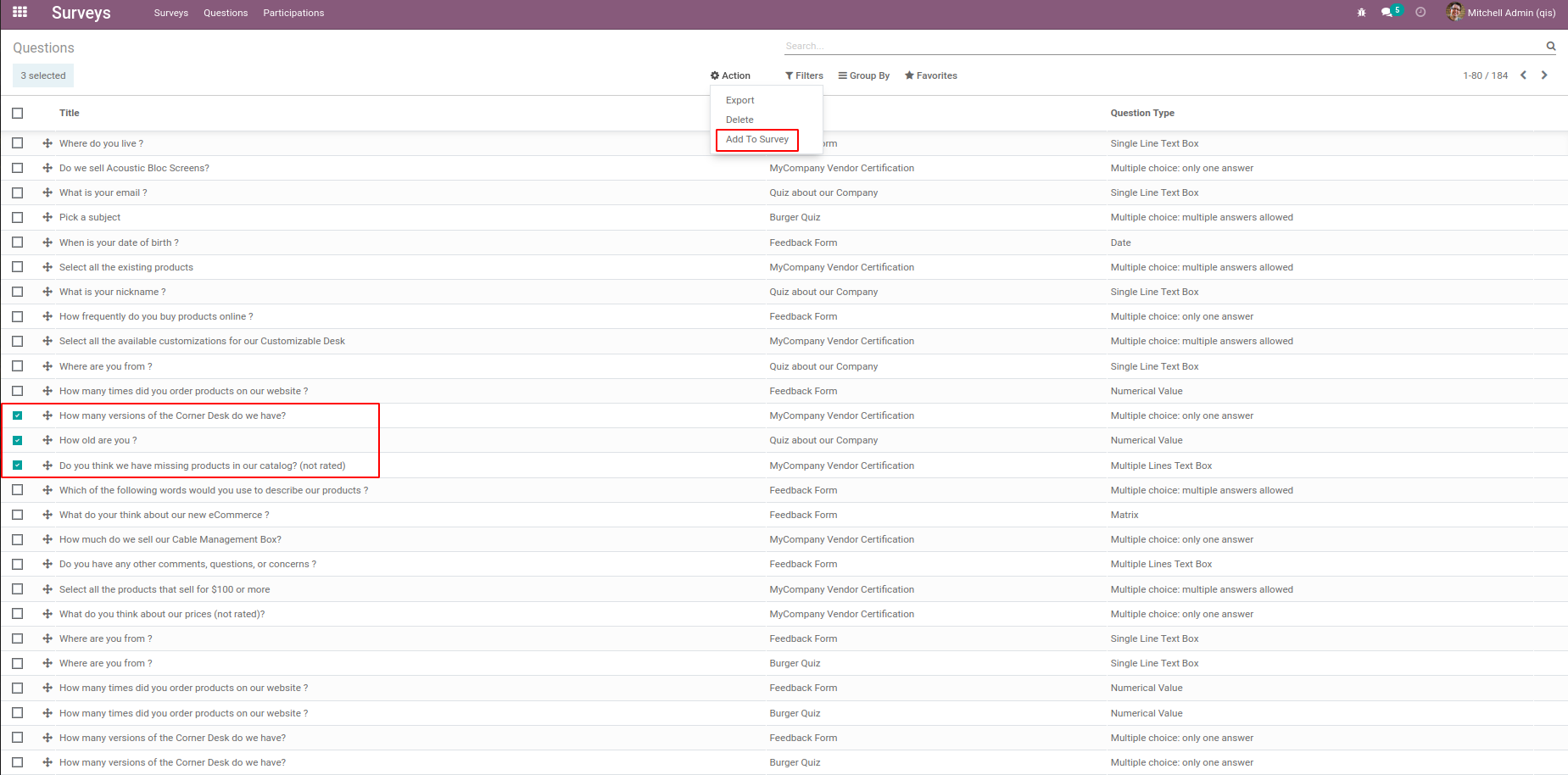 Select the questions for duplication. Then click on Actions -> Add To Survey.