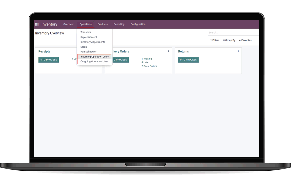 Go to "Operations" Menu in Inventory, You can find Incoming Operation Lines and Outgoing Operation Lines menus.