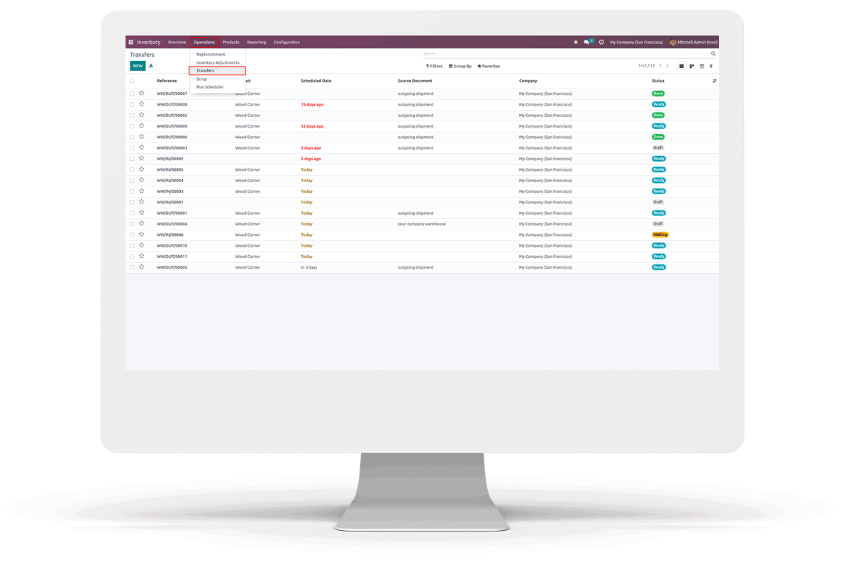 Now create a transfer for receipt. Select the operation type as 'Receipt'. We can see that a toggle button is present on the right upper corner of the order line. This button is for selecting all the products from the order line.