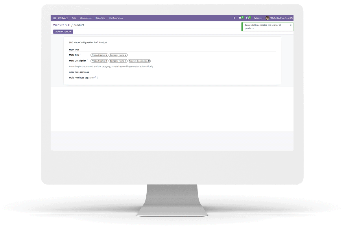 Here, the module assists you in automatically generating meta titles, descriptions, and keywords for each product and product group. For instance, with odoo you have to specify each meta title, meta description, and meta keyword individually. However, with this software you can create meta contents with only one click.