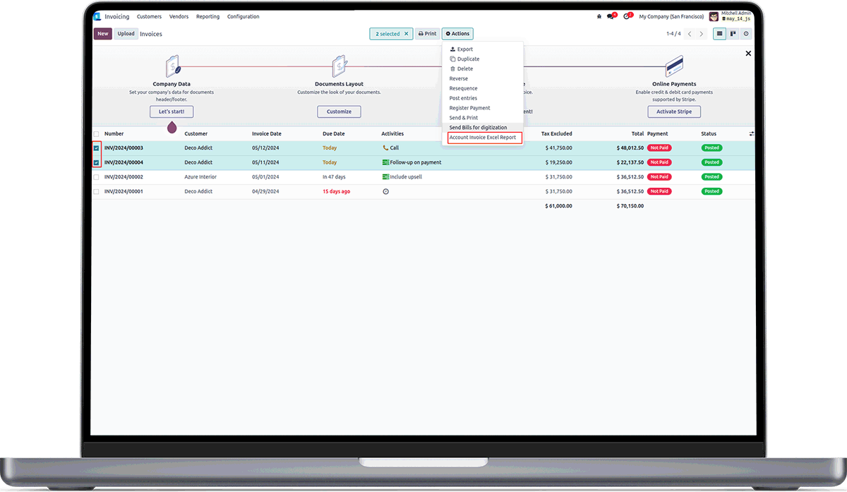 By clicking the Account Invoice Excel Report button we can print the Excel report